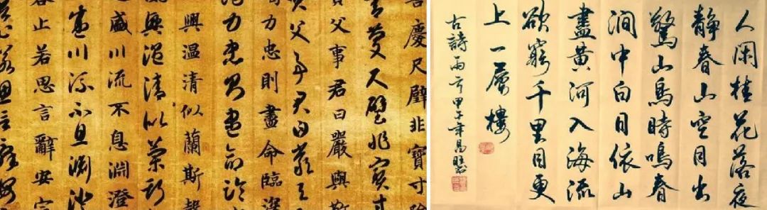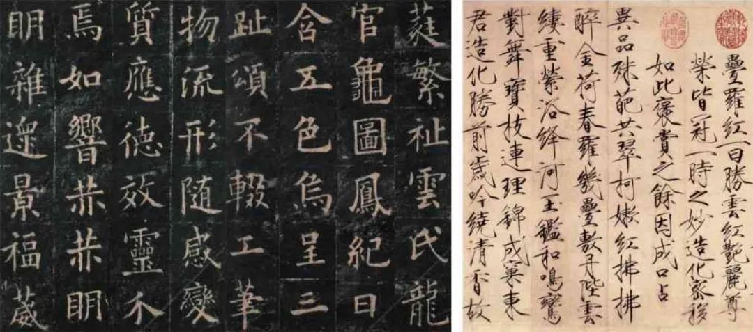左:《智永真草千字文》局部。智永,隋代僧人,姓王名法极,为王羲之七世孙。可以看到其内容是一列真书(楷书)一列草书交错而成。《寓意编》云:“智永真草千文真迹,气韵飞动,优入神品,为天下法书第一。”
