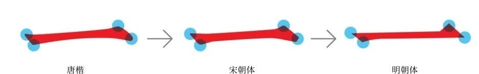 中国汉字的衬线体中明朝体的演变脉络。它是楷书印刷化催生的产物,可以看到,笔画的处理因为雕刻便捷的原因,呈现硬线条的概括趋势。