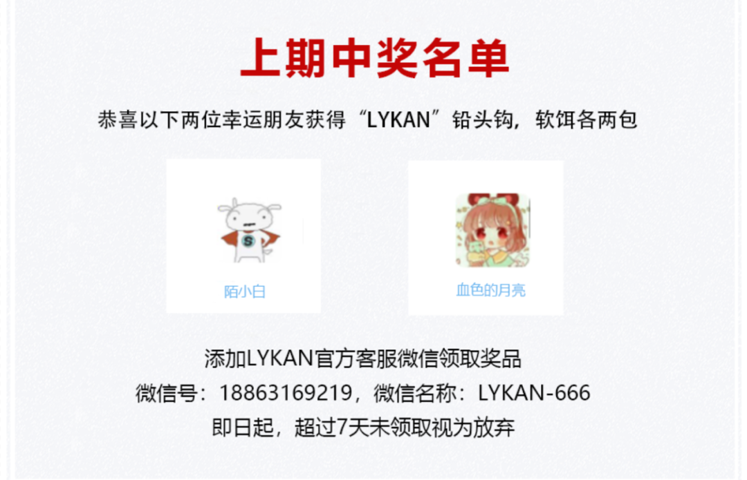 本期奖品:LYKAN奈肯软饵,铅头钩各两包。