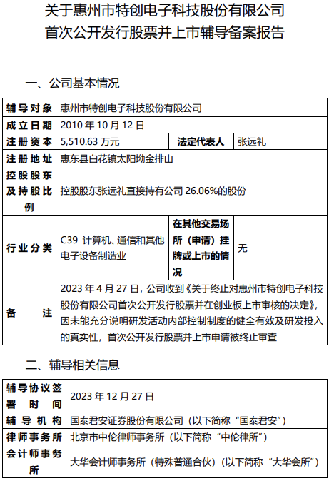 2024年1月4日,中国证监会披露公告,同意广州广合科技股份有限公司(以下简称“广合科技”)首次公开发行股票的注册申请。广合科技主营业务是印制电路板的研发、生产和销售,自成立以来主营业务没有发生变化。公司PCB产品主要定位于中高端应用市场,在产品精度、密度和可靠性等方面具有较高要求,市场布局覆盖“云、管、端”三大板块,产品广泛应用于服务器、消费电子、工业控制、安防电子、通信、汽车电子等领域,其中服务器用PCB产品的收入占比约七成,是公司产品最主要的下游应用领域,为全球大数据、云计算等产业提供重要电子元器件供应。广合科技2023年11月7日更新的招股书显示,本次募集资金扣除发行费用后,公司将用于扩大生产规模、补充流动资金及偿还银行贷款等项目,具体投资项目按轻重缓急排列如下:2024年1月4日,惠州市特创电子科技股份有限公司(以下简称“特创科技”)再次向广东证监局办理了辅导备案登记,拟首次公开发行股票并上市,辅导券商为国泰君安。公司成立于2010年,惠东总部现有员工近千人,企业专注印制电路板十余年,拥有惠东、淮安和安庆三大生产基地。公司自成立以来一直从事PCB的研发、生产和销售,产品包括单/双面板和多层板,经过多年产品的研发及工艺技术的积累,产品类型覆盖LCD光电板/Mini-LED背光板、厚铜板、金属基板、HDI板、高频高速板等特殊基材、特殊工艺类型的产品。公司致力于为全球客户提供高品质、高可靠性的产品,产品广泛应用于工控新能源、液晶显示、消费电子、LED照明、通信等领域。2024年1月21日,证监会发布关于睿龙材料科技无锡股份有限公司(以下简称“睿龙科技”)首次公开发行股票并上市辅导备案报告。1月6日,海通证券与睿龙科技签署了上市辅导协议。资料显示,无锡睿龙新材料科技有限公司创建于2016年6月,是睿龙材料科技无锡股份有限公司全资子公司,公司主要生产基地坐落于美丽的太湖之滨马山镇,占地总面积31000平米,拥有现代化厂房8500平米,研发办公大楼6000平米。睿龙科技是一家生产高端高频材料的专业公司,高频覆铜板材料产品线齐全,能满足高性能射频印制线路板的各种特别需要。睿龙科技不但可以提供各种介电常数及极低损耗的高频覆铜板材料,而且可以配套提供做多层射频印制线路板所需的低介电常数及低损耗粘结片。---END---