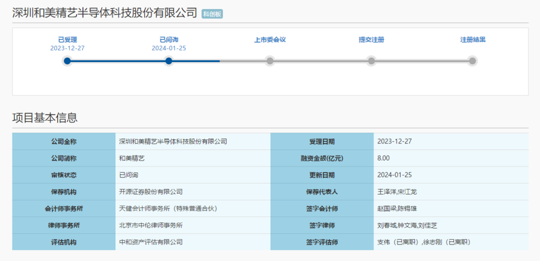 2024年1月25日,深圳和美精艺半导体科技股份有限公司(以下简称“和美精艺”)申请上交所科创板上市审核状态变更为“已问询”。