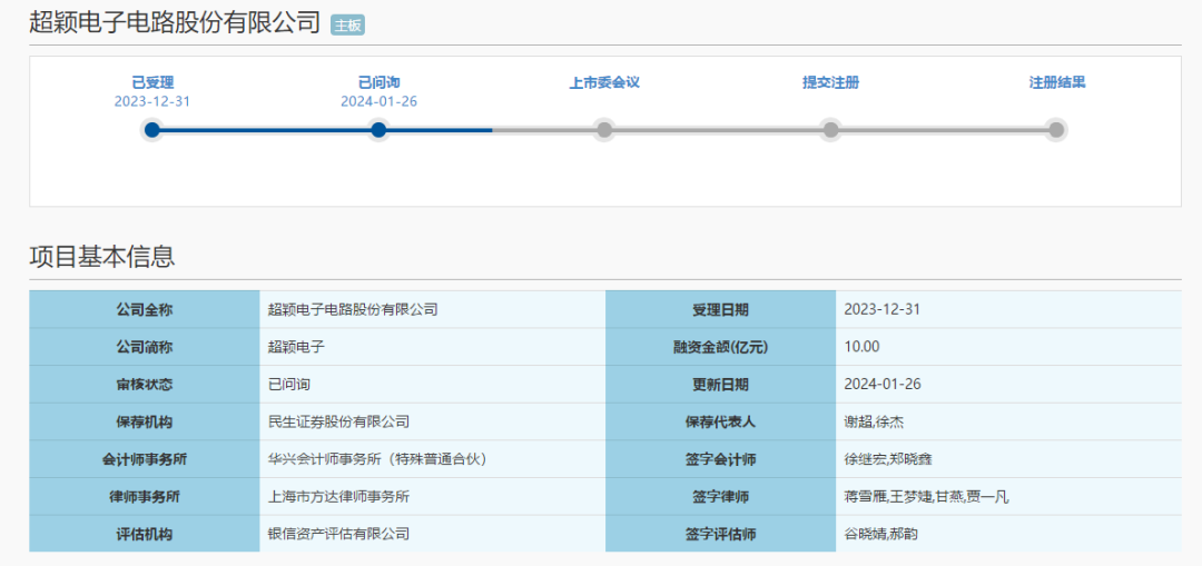 与您一路同行,做您最忠实的拥护者--PCB行业融合新媒体-2024年最有价值的电路板产业服务平台!欢迎您的关注与点赞!祝您事业有成!平安喜乐!2024年以来,多家PCB及行业企业IPO状态更新,离IPO上市更近一步。2024年1月26日,上海证券交易所官网显示,超颖电子电路股份有限公司(以下简称“超颖电子”)IPO状态更新为已问询,准备在上交所主板上市。