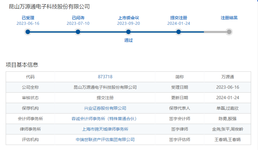 招股说明书显示,公司自2007年成立至今,一直专注于IC封装基板领域,从事IC封装基板的研发、生产及销售,系内资厂商中少数几家全面掌握自主可控IC封装基板大规模量产技术的企业。本次公司拟使用募集资金8亿元用于珠海富山IC载板生产基地建设项目(一期)及补充流动资金。2024年1月24日,北京证券交易所官网显示,昆山万源通电子科技股份有限公司(以下简称“万源通”)IPO状态更新为提交注册。