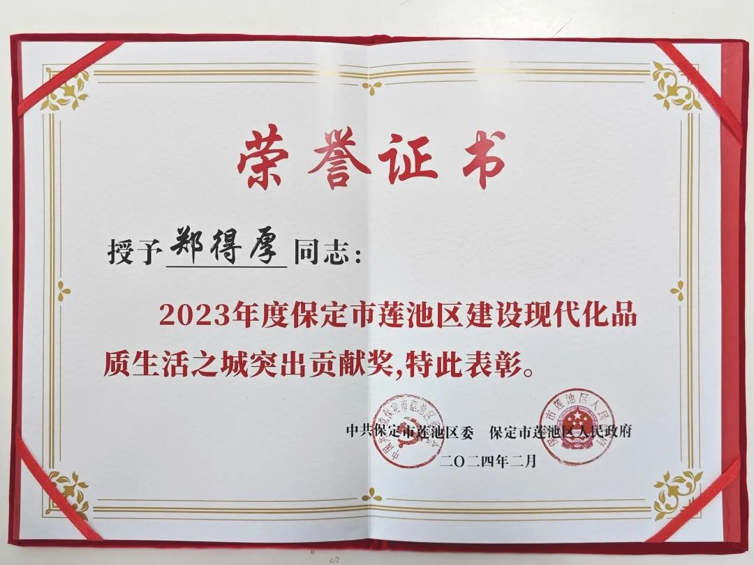 中联农集团董事长郑得厚荣获“2023年度保定市莲池区建设现代化品质生活之城突出贡献奖”,中联农全链物流园总经理胡夕朝获评“2023年度莲池区招商引资工作先进个人”。