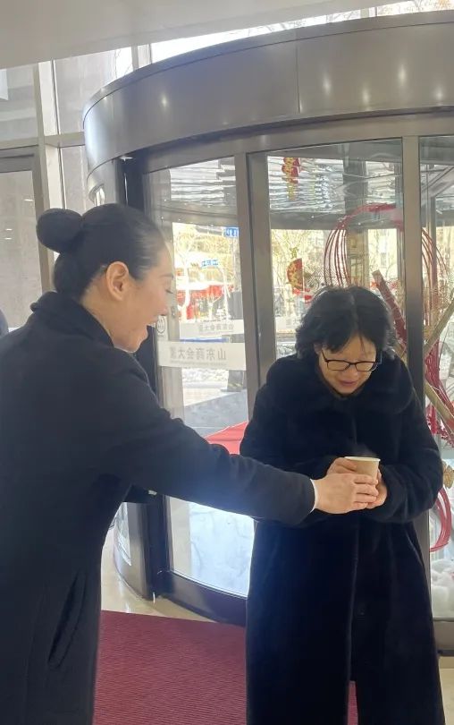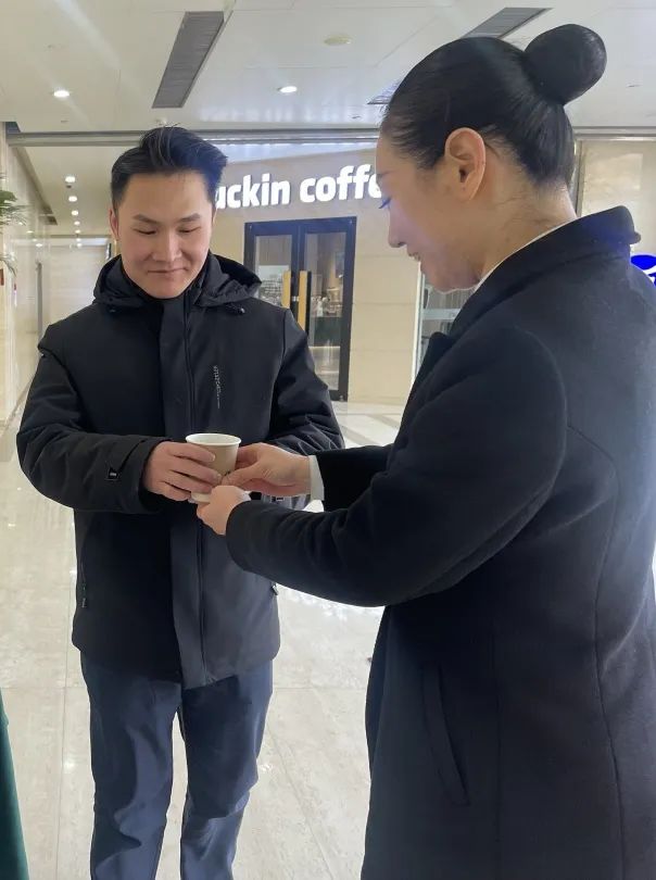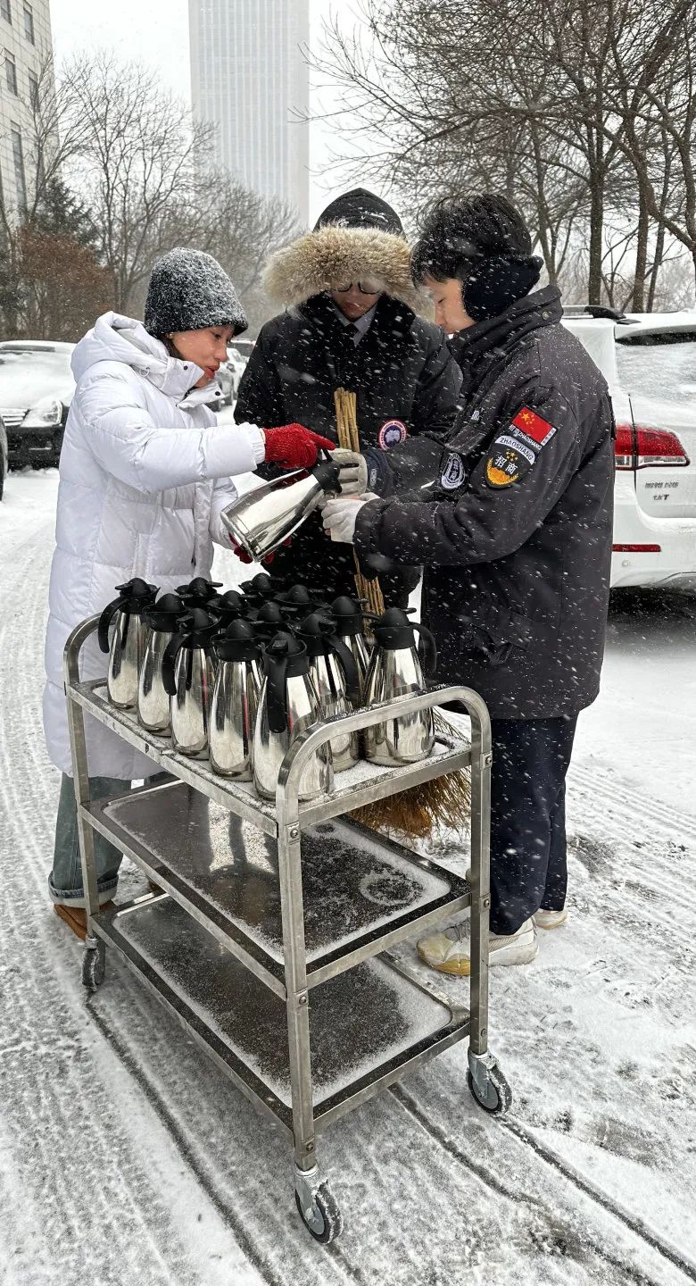 将一杯杯暖心姜枣茶送到扫雪员工与客户手中