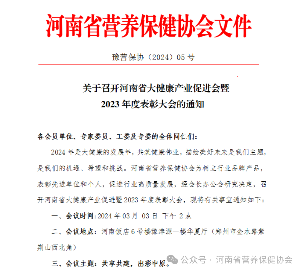 关于召开河南省大健康产业促进会暨2023年度表彰大会的通知: