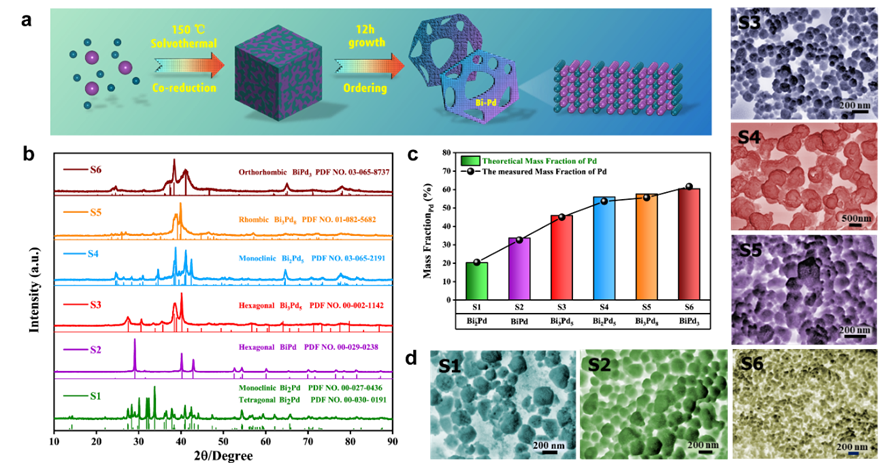 基于此,该研究提出了一种通用性的共还原体系,通过改变前驱体的类型及比例实现了,报道了Bi2Pd、BiPd、Bi3Pd5、Bi2Pd5、Bi3Pd8、BiPd3这六种有序Bi-Pd金属间化合物(IMCs)的可控合成。XRD及AAS结果均表明Bi-Pd