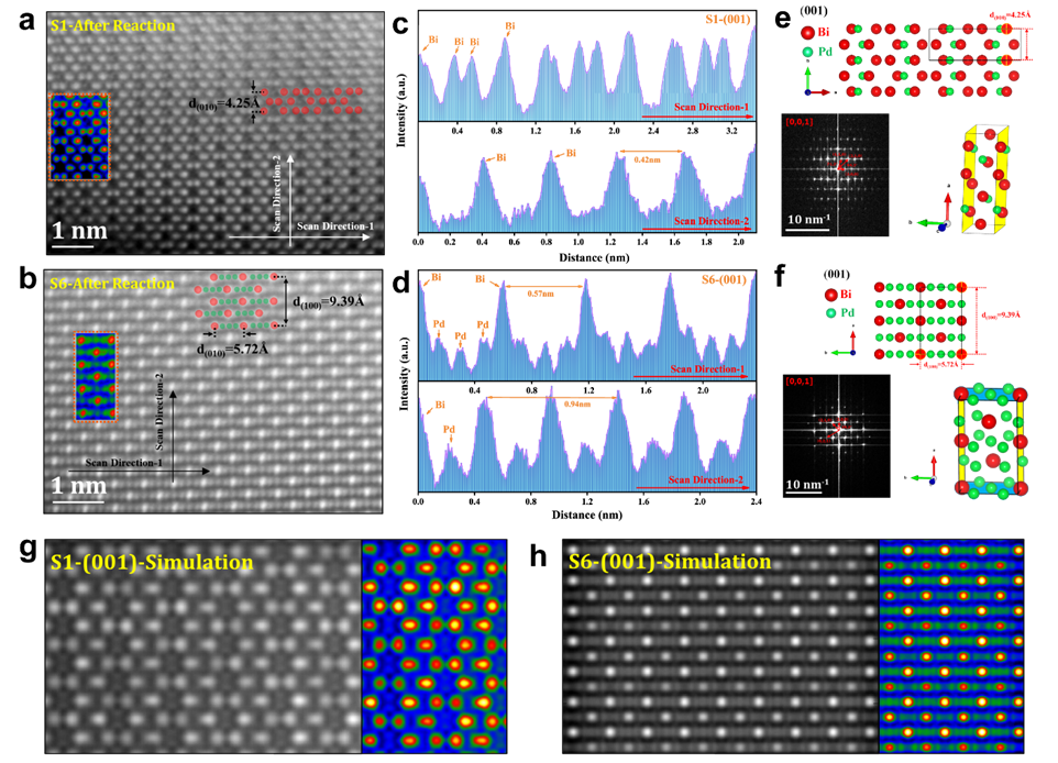 此外,对长时间电解反应后的样品进行了进一步的结构表征。XRD及HAADF数据表明,Bi-Pd IMCs在长时间电解过程中均保持了结构的稳定,未出现明显的结构变化及表面重构现象。