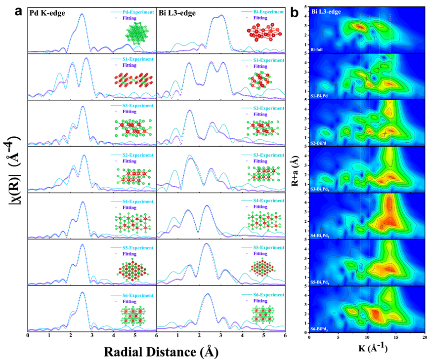 图2. Bi-Pd金属间化合物的原子分辨率的HAADF-STEM表征通过分析6种Bi-Pd IMCs的XANES和EXAFS拟合结果,得到配位元素的键长、配位数等结构信息。从电子结构的角度证明了6种有序Bi-Pd金属间化合物的成功合成。