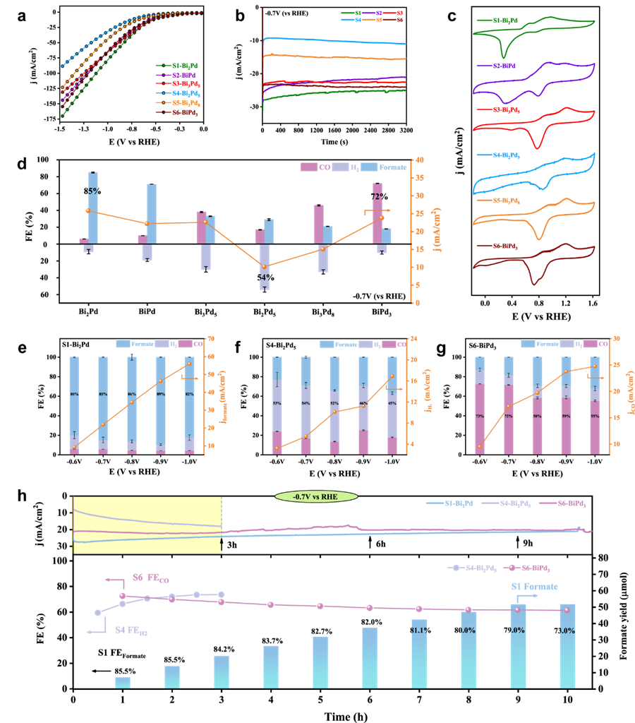 值得注意的是,这6种Bi-Pd IMCs不仅在电催化CO2还原反应中表现出优异的反应活性和稳定性,而且还具有相依赖的选择性。在气体扩散电极上,分别表现出了对甲酸盐(Bi2Pd, FE>80%),CO(BiPd3,FE>70%)以及H2(Bi2Pd5, FE≈50%)的高选择性。