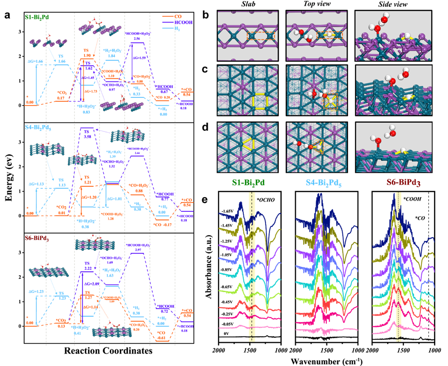 为了从理论上深入了解这种特殊的相依赖的选择性,该研究又进行了理论计算与原位表征。研究人员构建了Bi2Pd (100)、Bi2Pd5 (001)、BiPd3 (100)作为理论模型,针对CO2→HCOOH,CO2→CO,H2O→H2这三条反应路径,计算了每个基元反应中的反应中间体及部分过渡态分别在三个Bi-Pd IMCs表面的吸附能。结合三者的不同有序结构,研究发现正是Bi原子与Pd原子在表面的不同排布方式使得CO2第一步得电子加氢后倾向以不同的吸附构型稳定在催化剂表面。其中Bi2Pd (100)更有利于*OCHO双位点吸附构型的稳定及甲酸盐的生成,BiPd3 (100)更有利于*COOH单位点吸附构型的稳定及CO的生成,Bi2Pd5(001)则更有利于*H的吸附及H2的生成。原位FTIR实验也进一步检测到了不同样品表面上对应关键中间体的信号,验证了理论计算的结果。