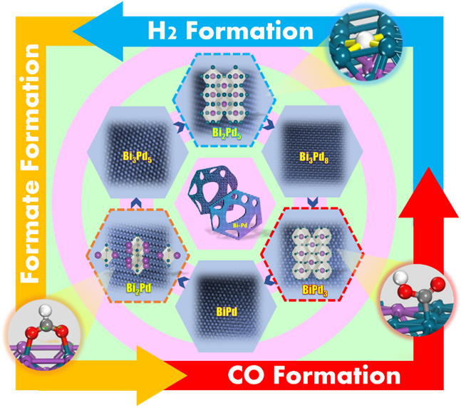 论文DOI: 10.1038/s41467-024-46072-7金属间化合物作为一类新兴的催化剂,具有固定的化学组成和有序的原子排列,是研究催化结构与性能之间精确关系的理想模型。然而,将一种金属原子扩散到另一种金属的晶格之中形成有序的原子结构非常困难。而目前研究仍缺乏对金属间化合物的普适性制备方法,且对不同原子结构对催化反应的影响机制缺乏深入研究。因此,寻找合适的元素及合成体系,实现原子级微调结构以获得最佳的催化性能,对于深入理解不同结构与性能活性之间的关系具有重要意义。金属间化合物具有固定的化学组成和有序的原子排列,是研究结构与催化性能之间精确关系的理想模型。然而,将金属原子扩散到另一种金属的晶格中形成规则的金属占位仍然是巨大的挑战。本文开发了一种简单通用的溶剂热法合成了一系列Bi-Pd有序金属间化合物,包括Bi2Pd、BiPd、Bi3Pd5、Bi2Pd5、Bi3Pd8和BiPd3。并以电催化CO2还原反应作为模型反应,深入阐明了Bi-Pd金属间化合物与关键中间体之间的相互作用。特定的表面原子排列使Bi-Pd金属间化合物对*OCHO、*COOH和*H中间体具有不同的吸附能和吸附构型,从而选择性地生成甲酸(Bi2Pd)、CO (BiPd3)和H2(Bi2Pd5)。这项工作提供了对金属间化合物特定结构-性能相关性的全面理解,为精确调节催化剂材料结构提供了有价值的范例。