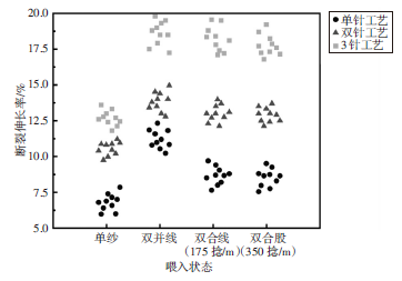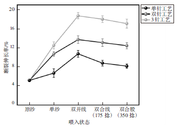(1)纺纱原料为单纱时,双针、3针带子纱的断裂伸长率比单针带子纱分别提高了3.9%和5.8%;3针带子纱的断裂伸长率比双针带子纱提高了1.9%。