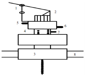 1—导纱钩;2—钩针;3—针筒;4—外壳;5、6、7—螺母;8—龙带