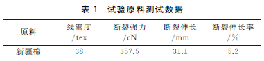 试验采用的原料为38tex新疆棉单纱,新疆棉的色泽、细度、弹性、纤维长度等都优于普通棉花。