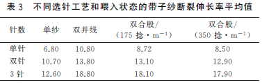 对图2中各组数据进行分析,得出不同选针工艺和喂入状态的内转式针筒所纺带子纱的断裂伸长率平均值,见表3。