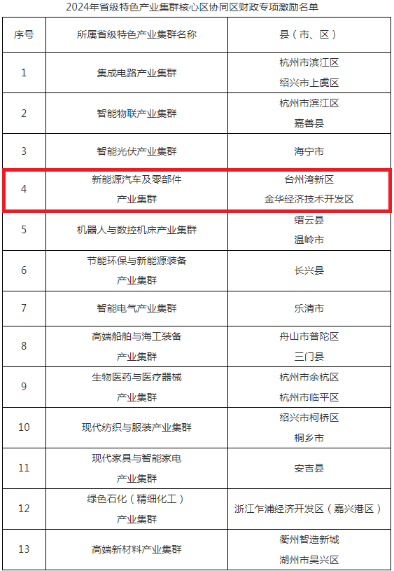 汽车产业是台州湾新区核心产业之一。2023年台州湾新能源汽车及零部件先进制造业集群营收达到377.84亿元,在全省节能与新能源汽车及零部件集群12个核心区、协同区中排第4。先后获得中国汽车零部件制造基地,浙江省特色小镇(台州汽车小镇)、节能与新能源汽车及零部件省级特色产业集群协同区等荣誉称号。