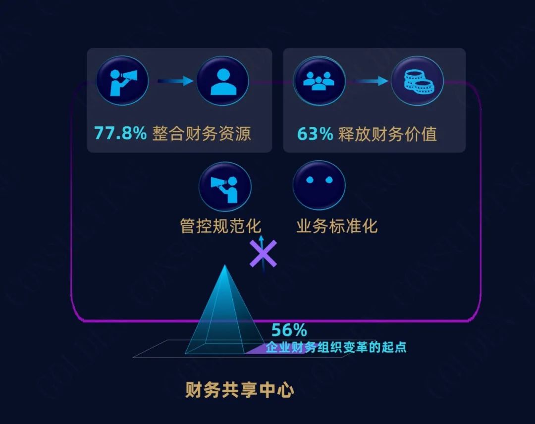 问卷调研结果显示,财务共享中心是大多数企业财务组织变革的起点(56%),其建立初衷从发挥管控作用和业务标准化规范化逐渐转变为整合财务资源(77.8%)和释放财务价值(63%)。