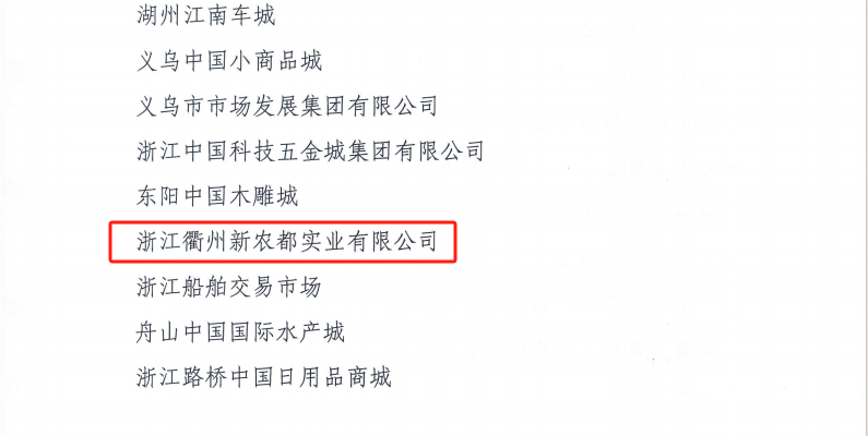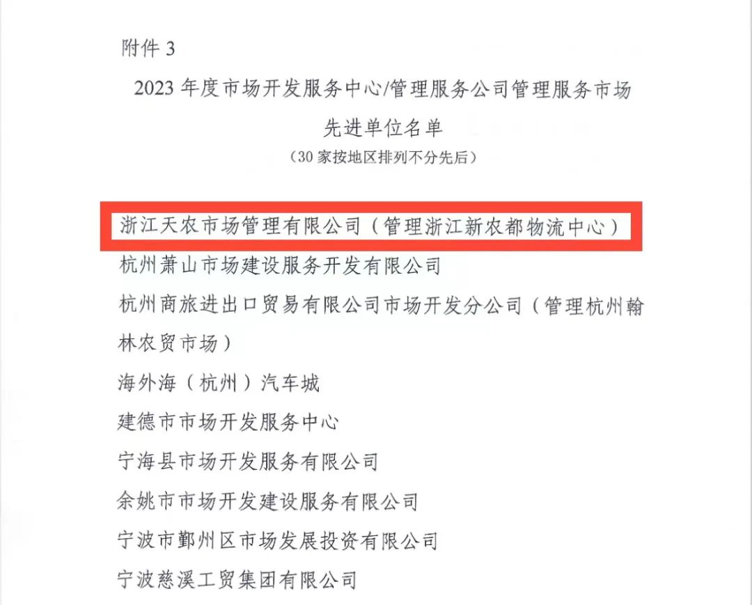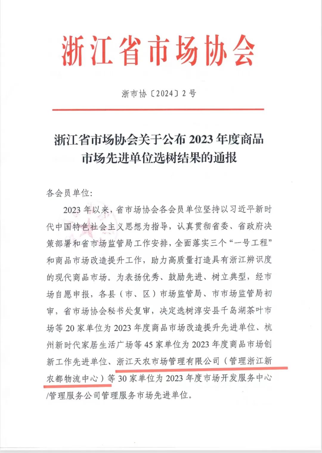 2月19日,浙江省市场协会印发《关于公布2023年度商品市场先进单位选树结果的通报》,浙江天农市场管理有限公司荣获“2023年度市场开发服务中心/管理服务公司管理服务市场先进单位”;浙江衢州新农都实业有限公司荣获“2023年度商品市场先进单位”荣誉称号。