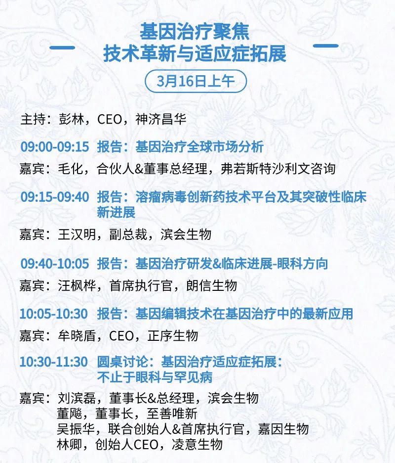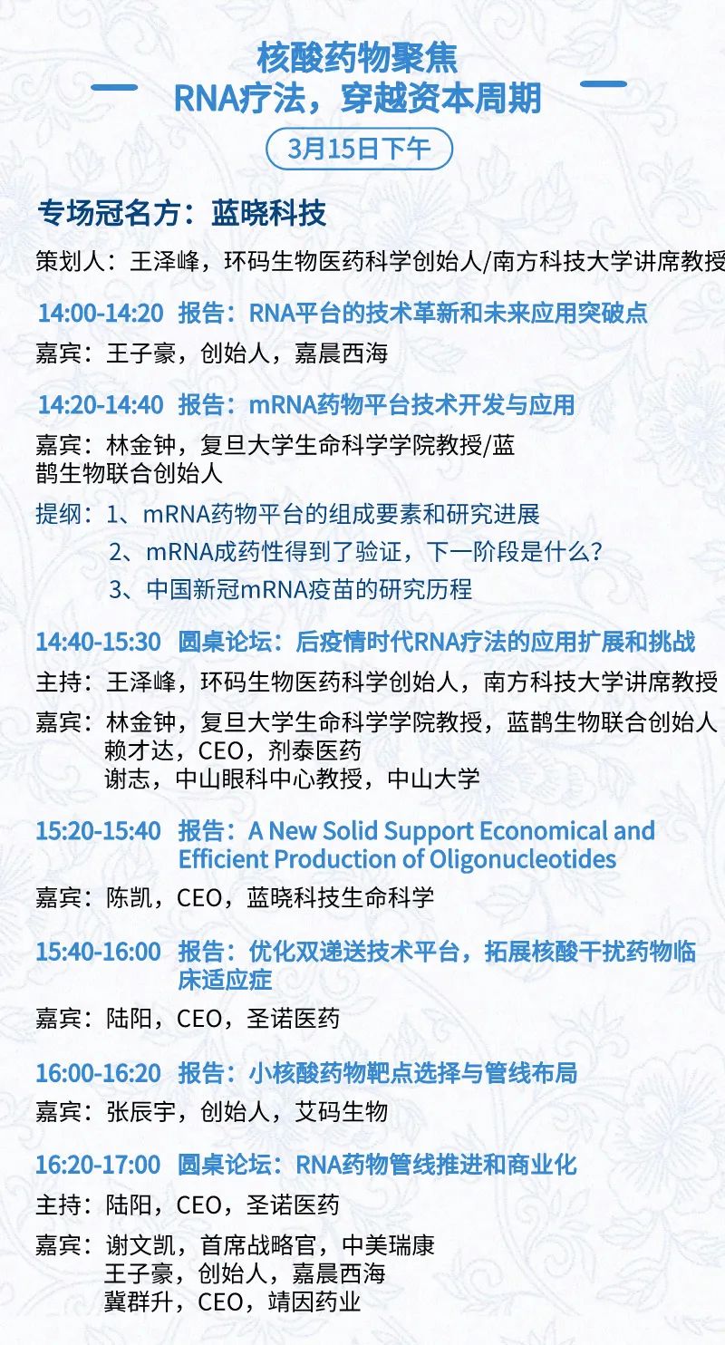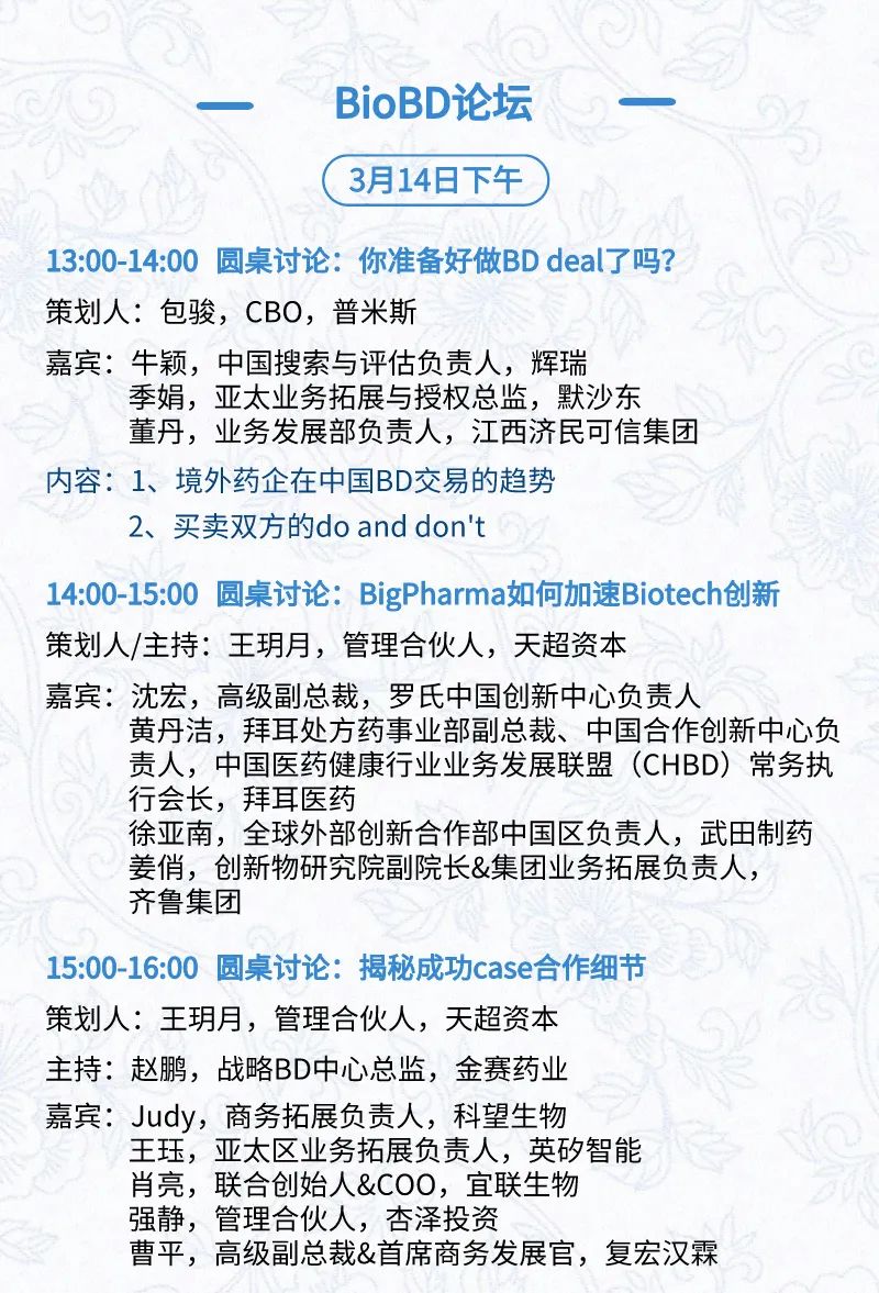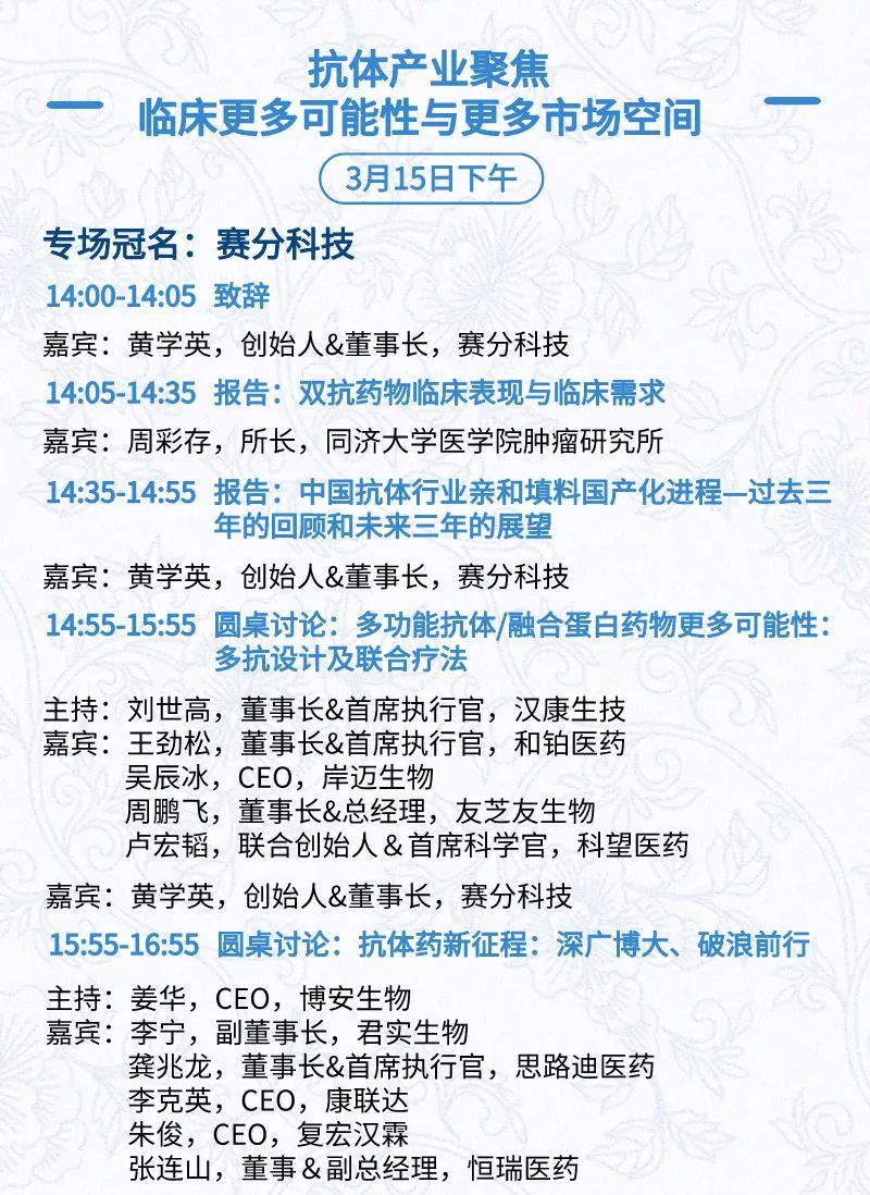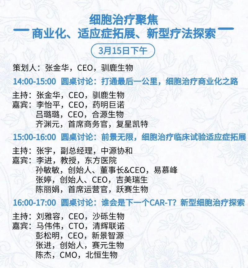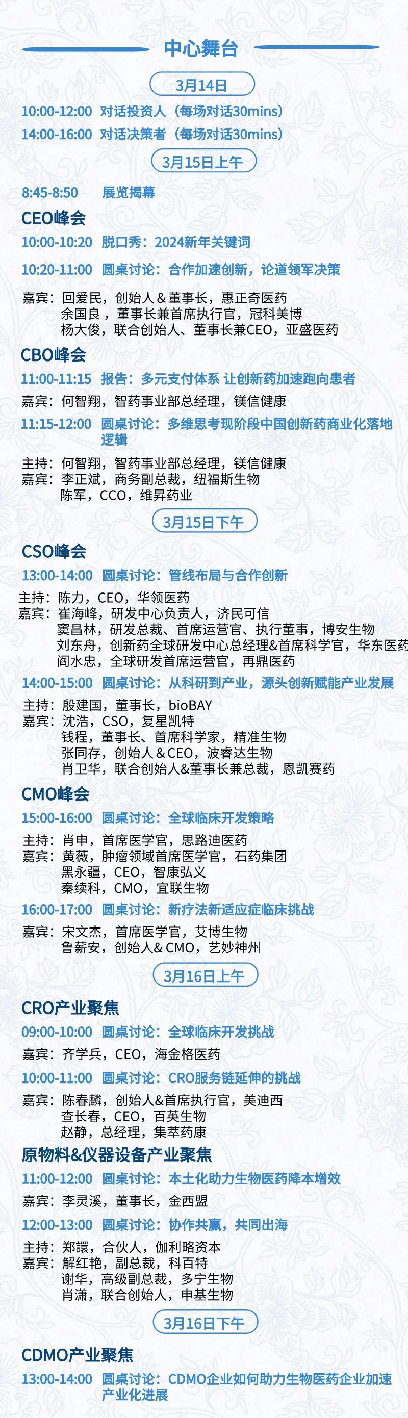 3月15日:开幕式、科学家峰会、细分赛道论坛(抗体、CGT、早研、临床、海外)、投融资&BD 论坛、中心舞台