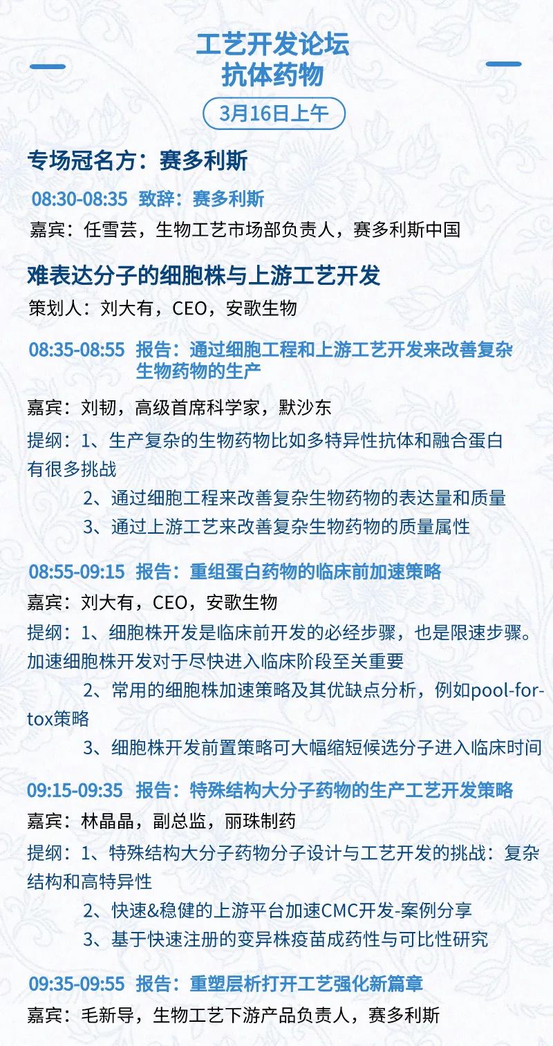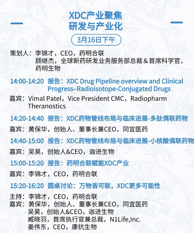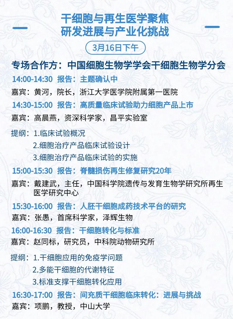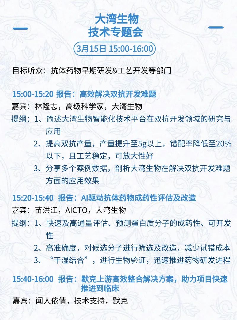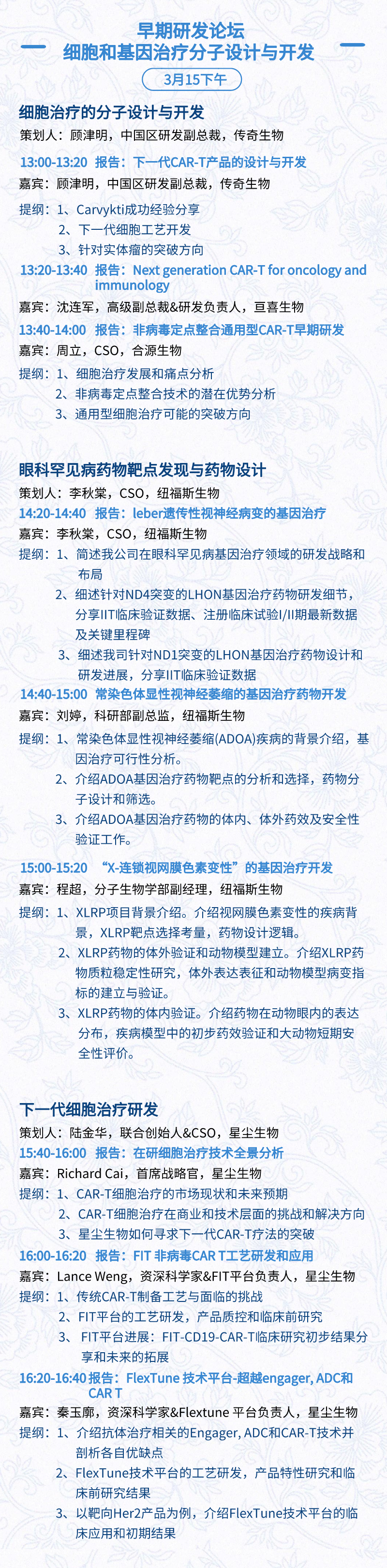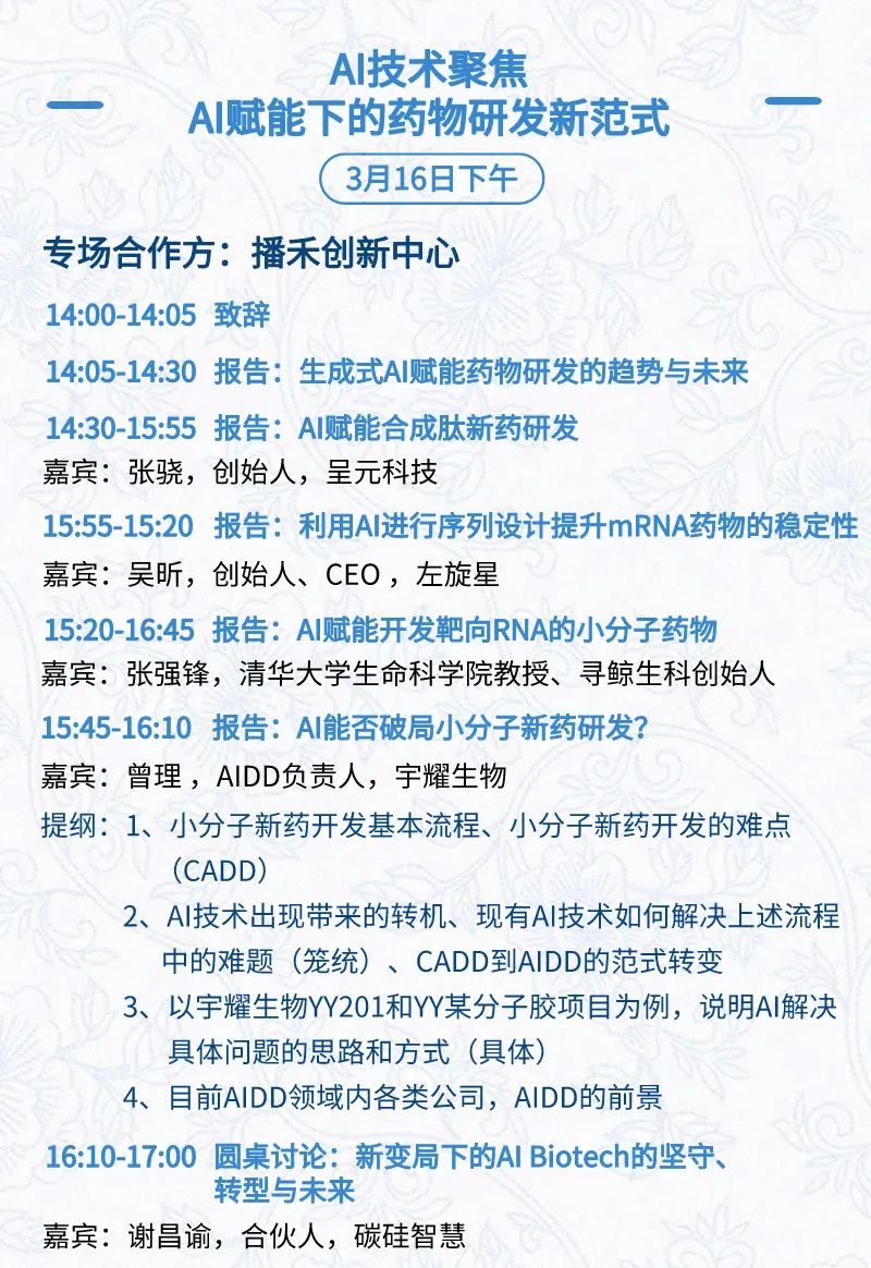 3月15日:开幕式、科学家峰会、细分赛道论坛(抗体、CGT、早研、临床、海外)、投融资&BD 论坛、中心舞台