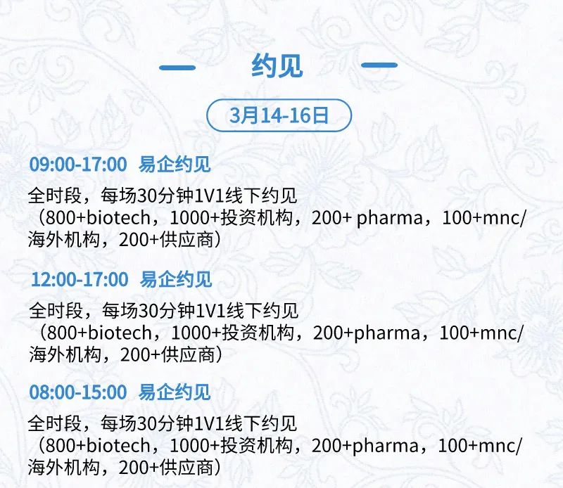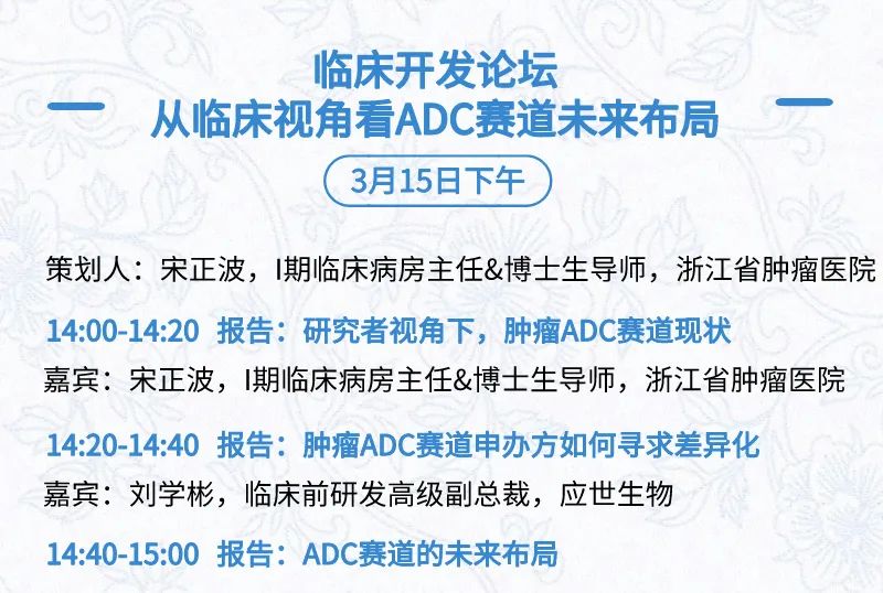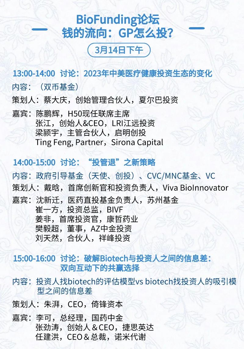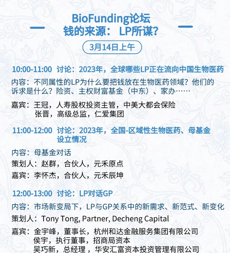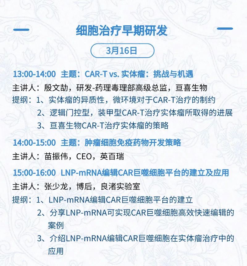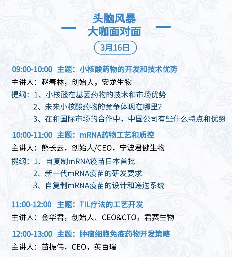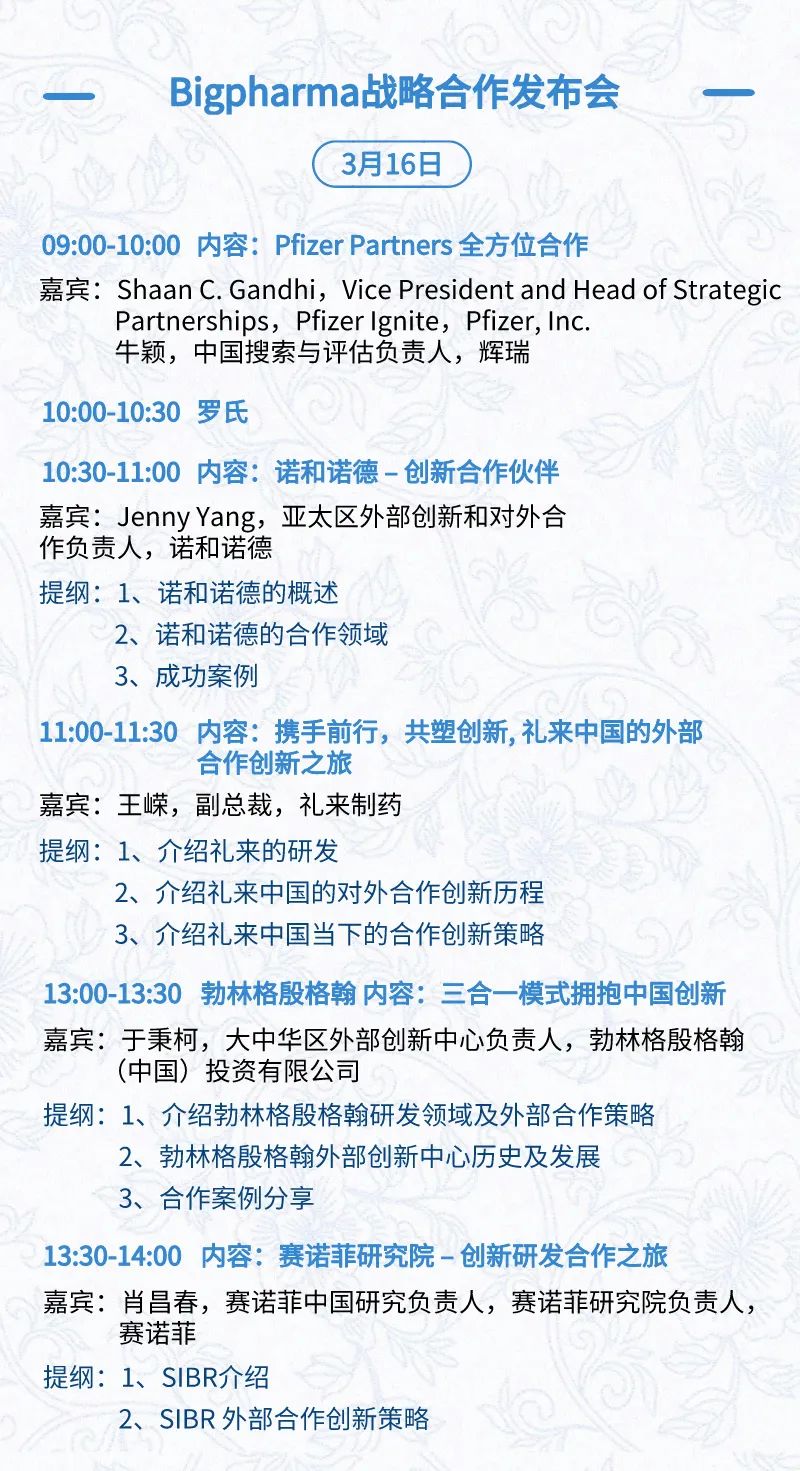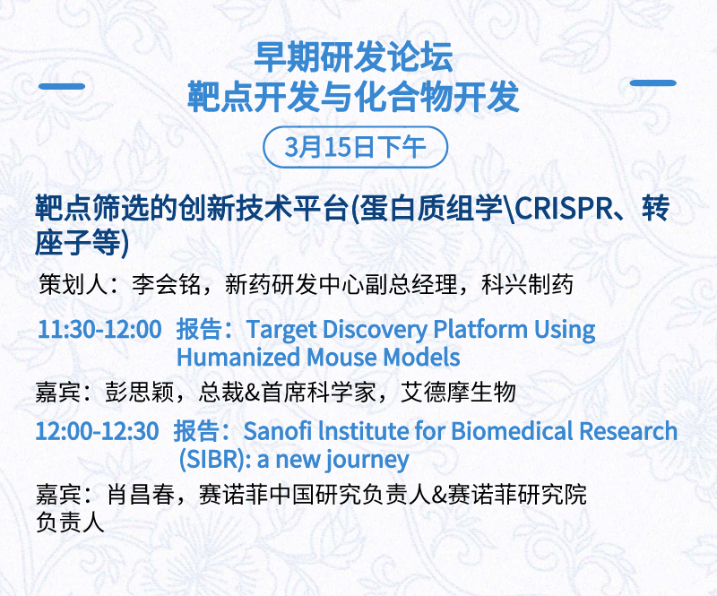 3月15日:开幕式、科学家峰会、细分赛道论坛(抗体、CGT、早研、临床、海外)、投融资&BD 论坛、中心舞台