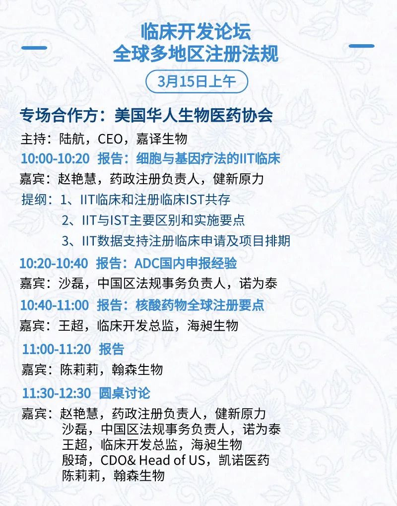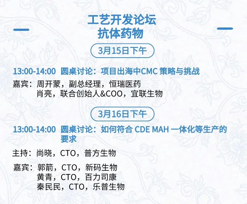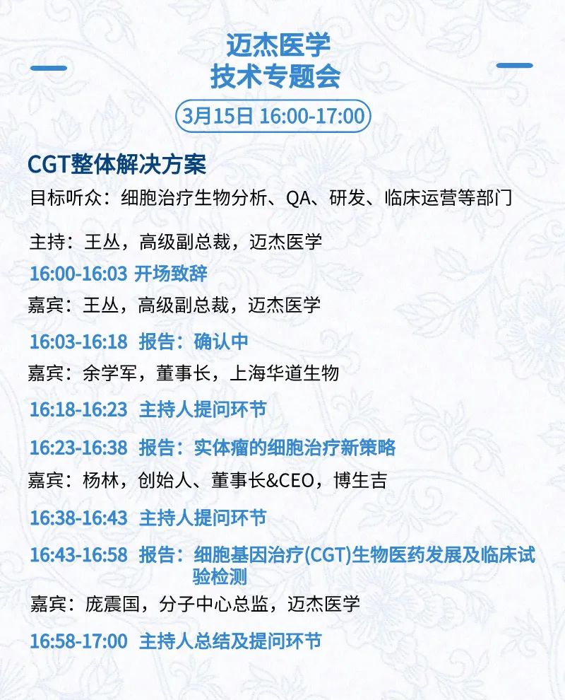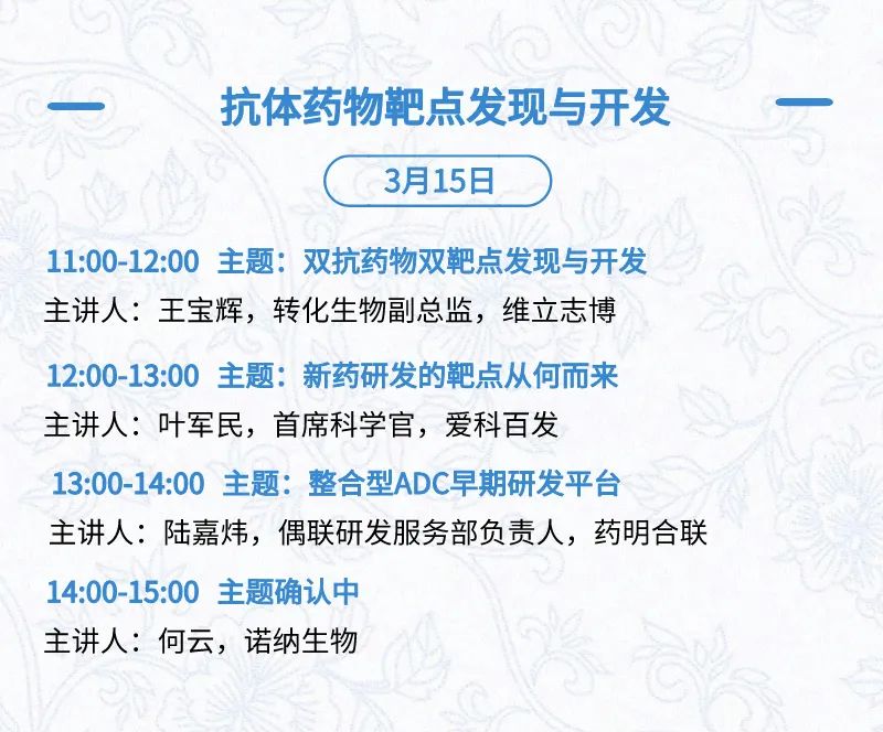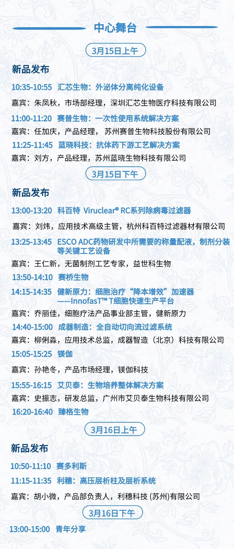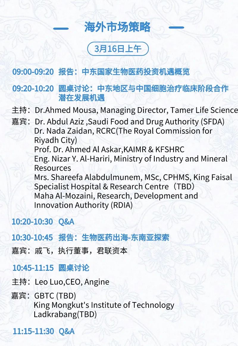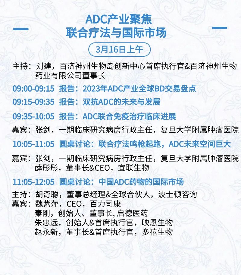 3月15日:开幕式、科学家峰会、细分赛道论坛(抗体、CGT、早研、临床、海外)、投融资&BD 论坛、中心舞台