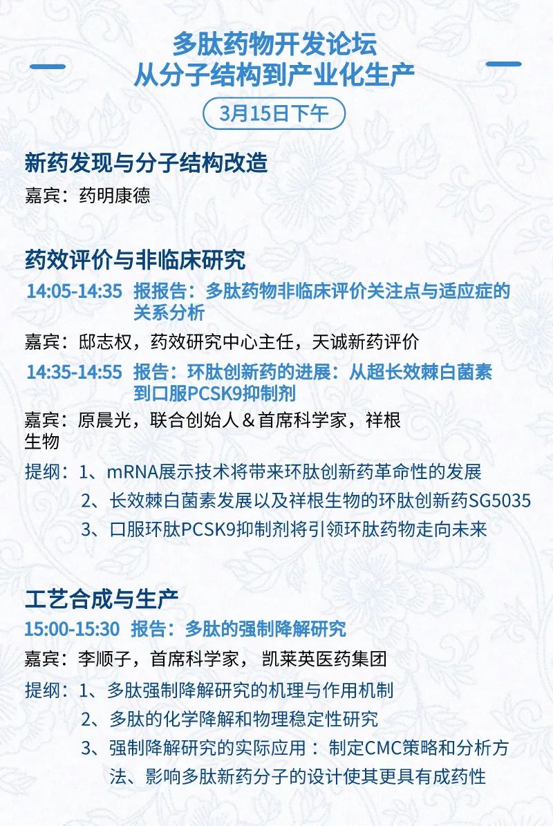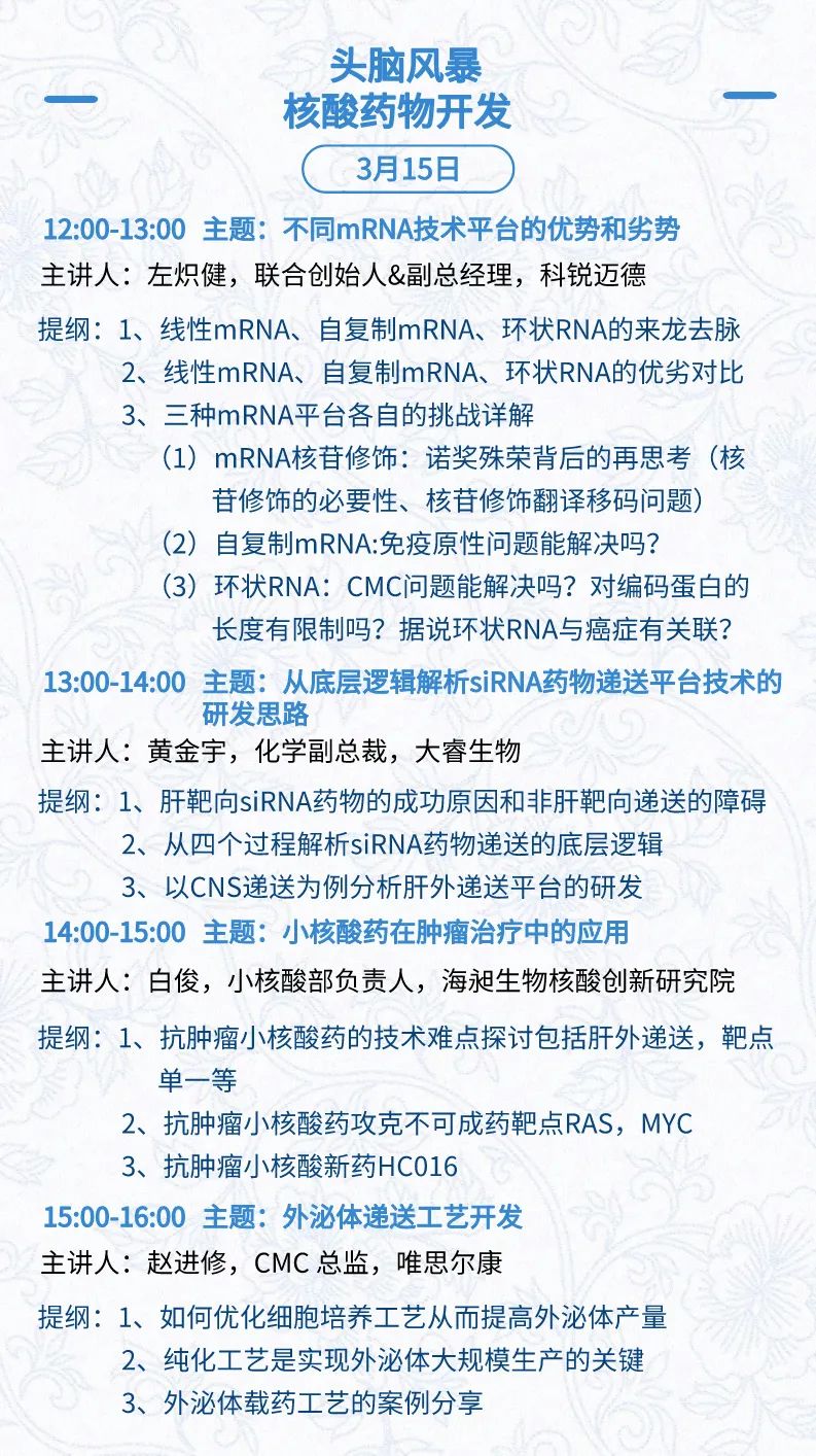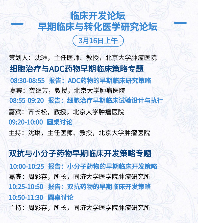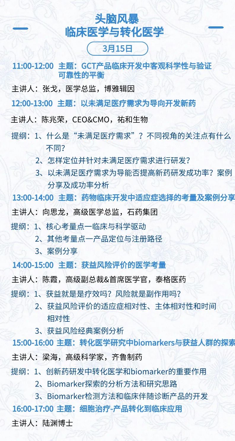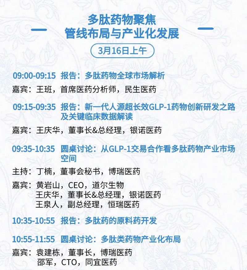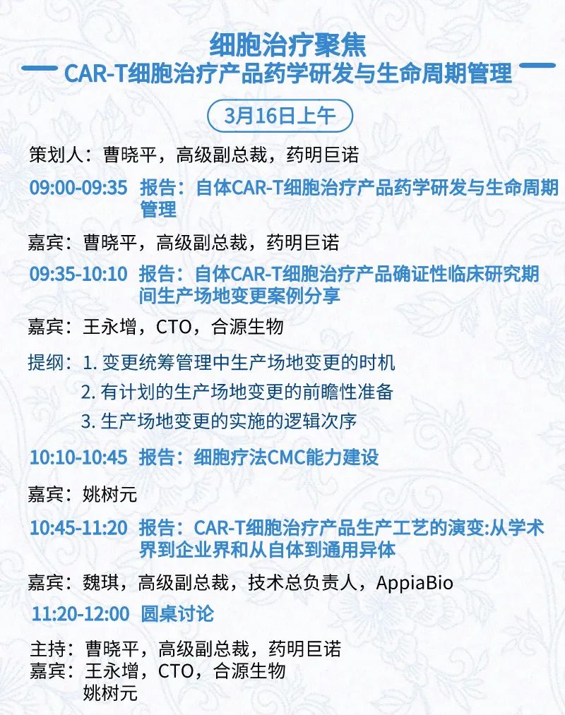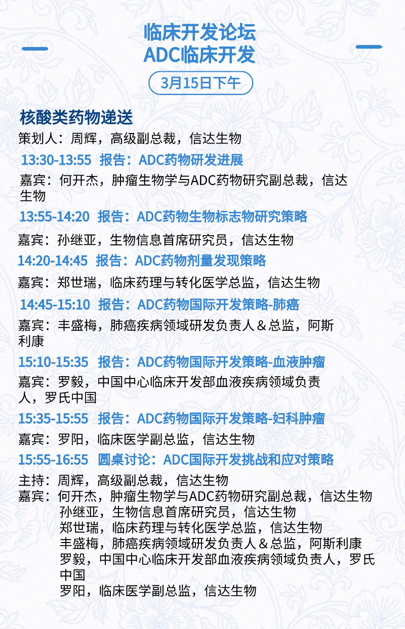 3月15日:开幕式、科学家峰会、细分赛道论坛(抗体、CGT、早研、临床、海外)、投融资&BD 论坛、中心舞台
