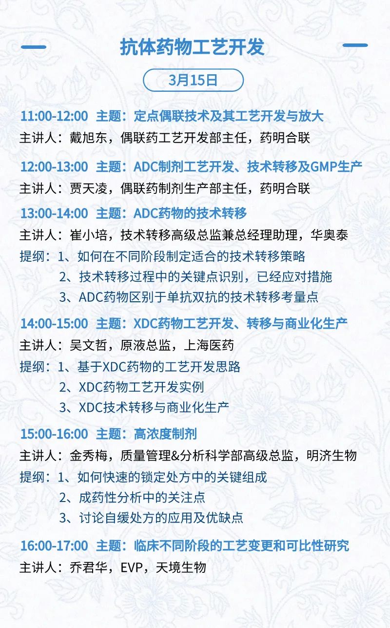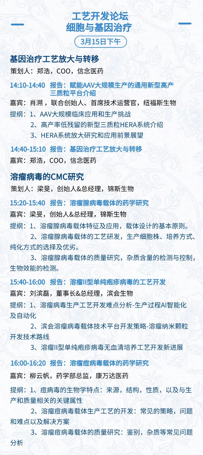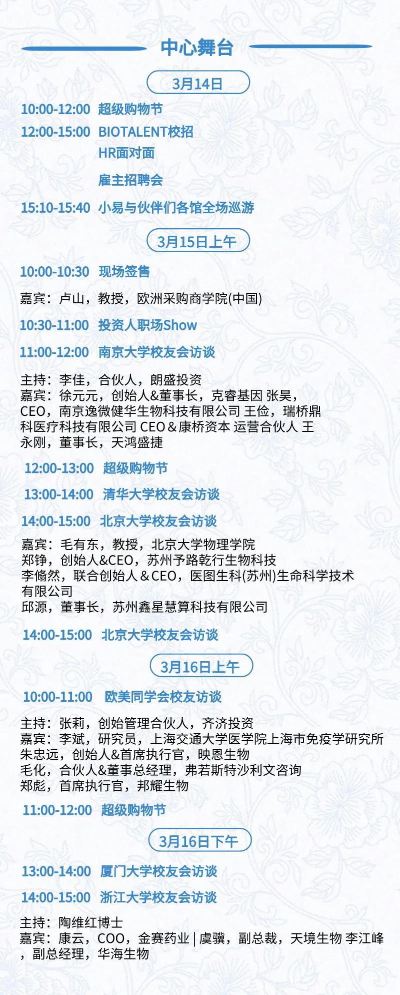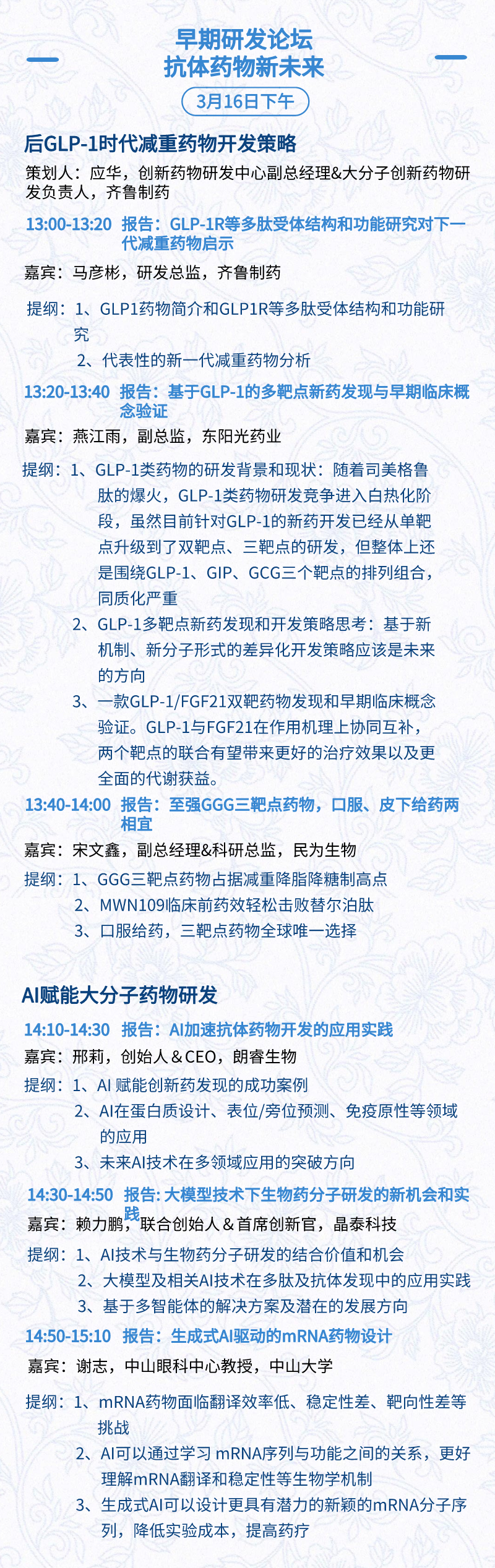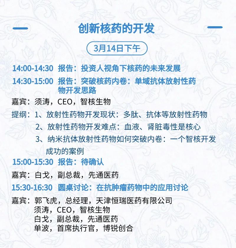 3月15日:开幕式、科学家峰会、细分赛道论坛(抗体、CGT、早研、临床、海外)、投融资&BD 论坛、中心舞台