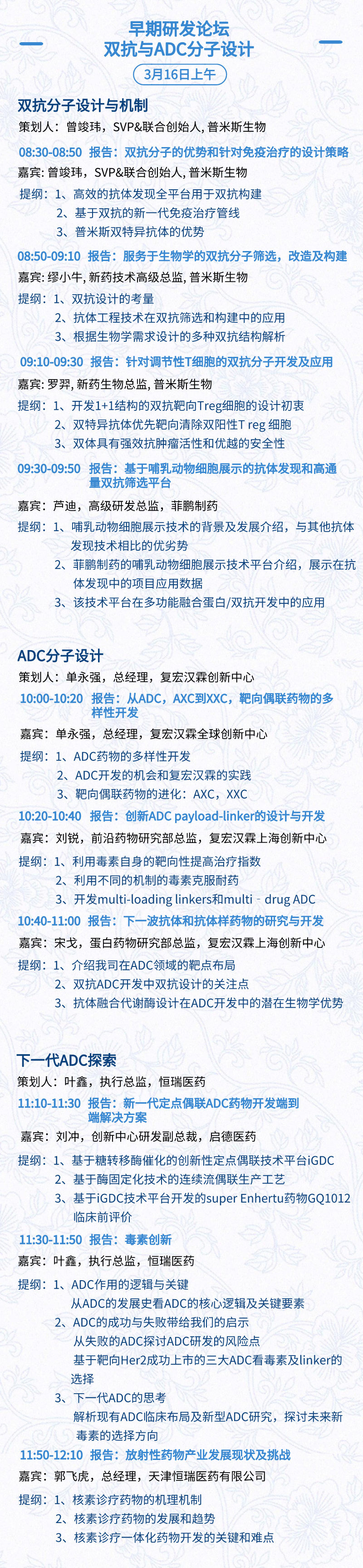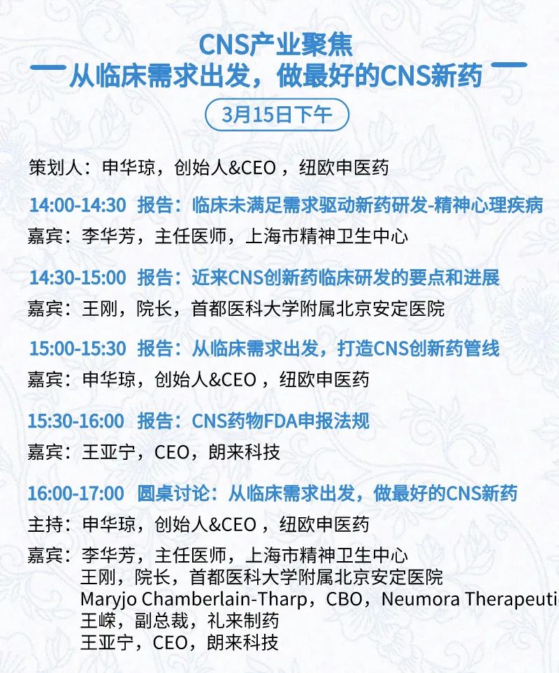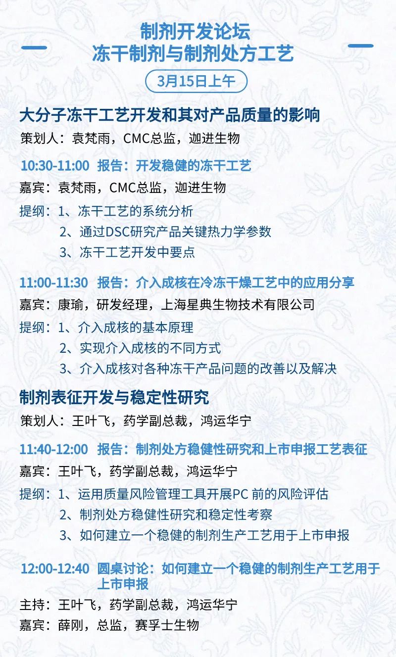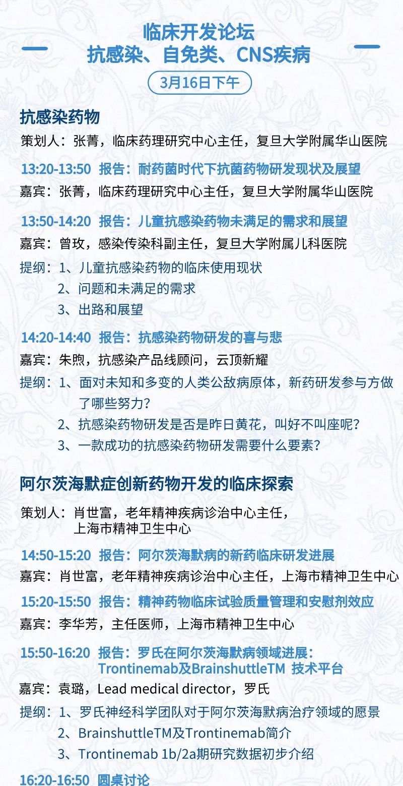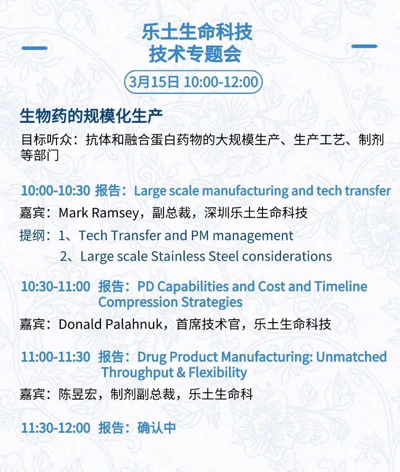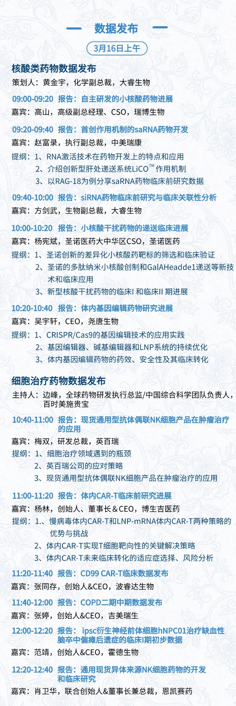3月15日:开幕式、科学家峰会、细分赛道论坛(抗体、CGT、早研、临床、海外)、投融资&BD 论坛、中心舞台