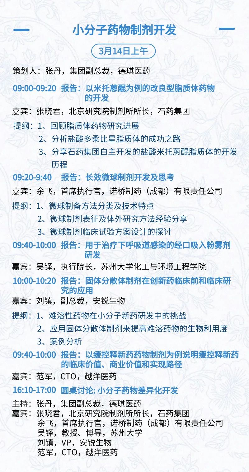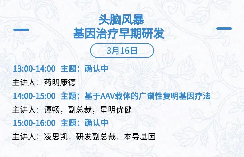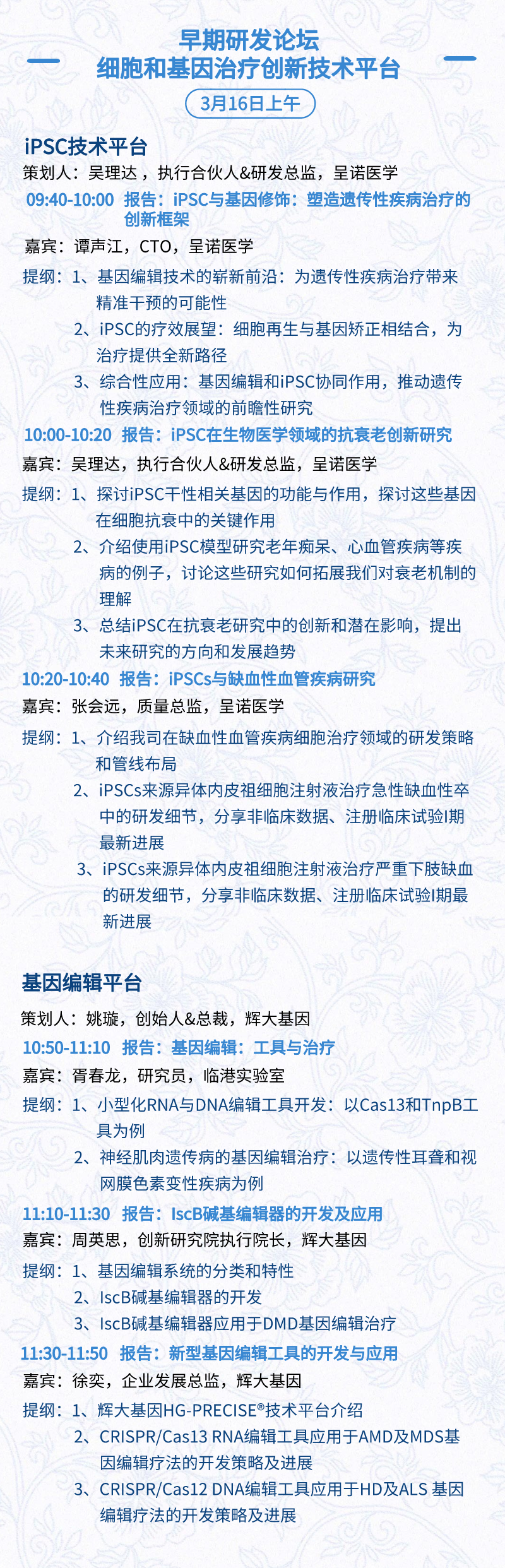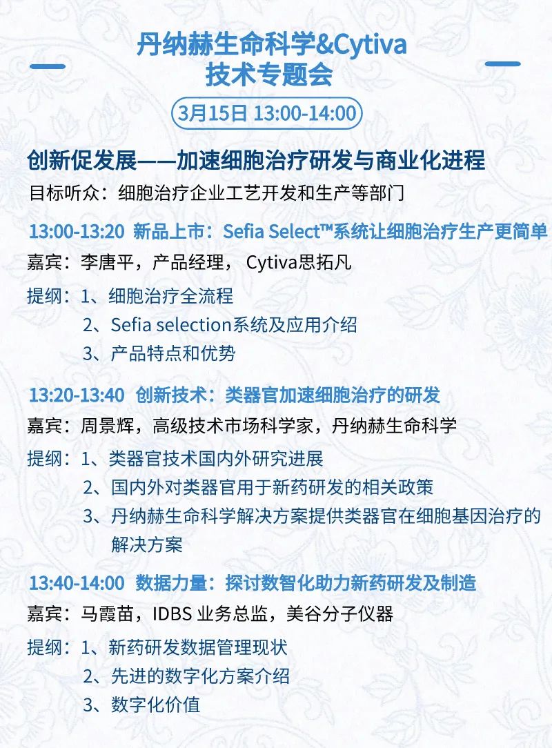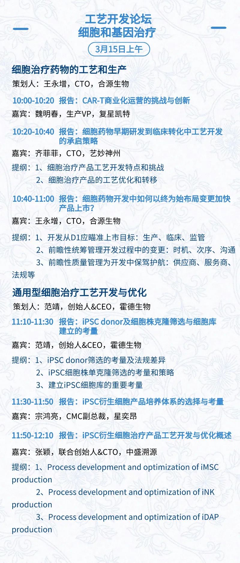 3月15日:开幕式、科学家峰会、细分赛道论坛(抗体、CGT、早研、临床、海外)、投融资&BD 论坛、中心舞台