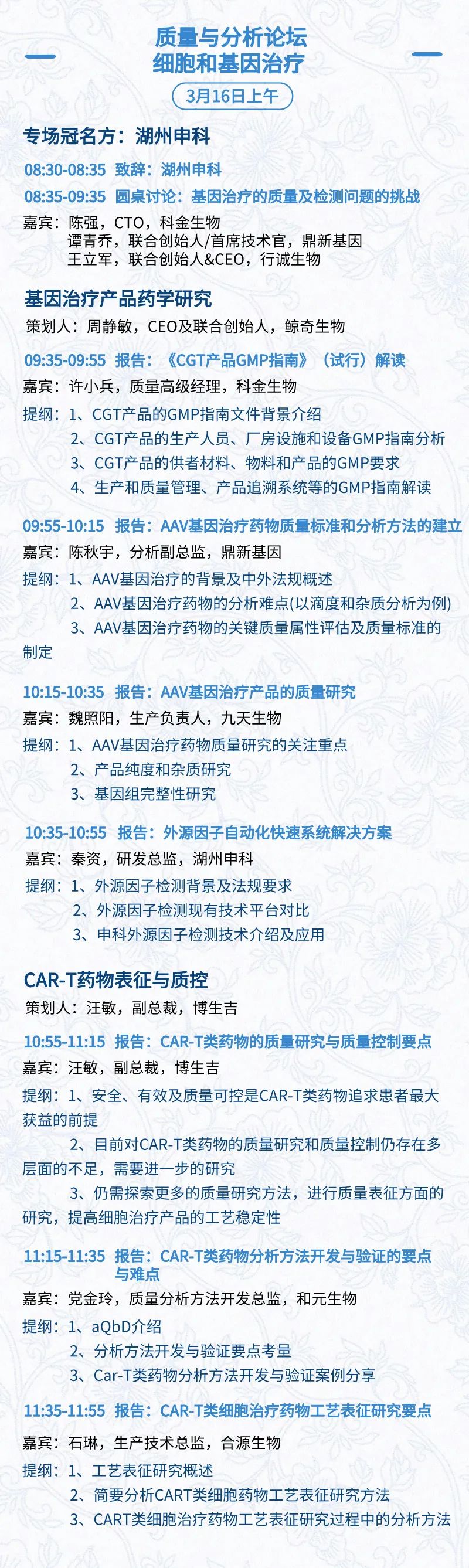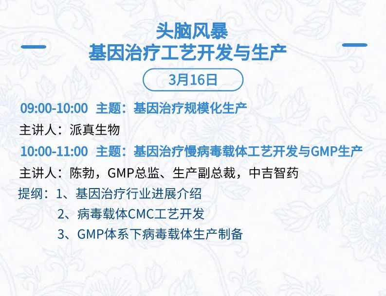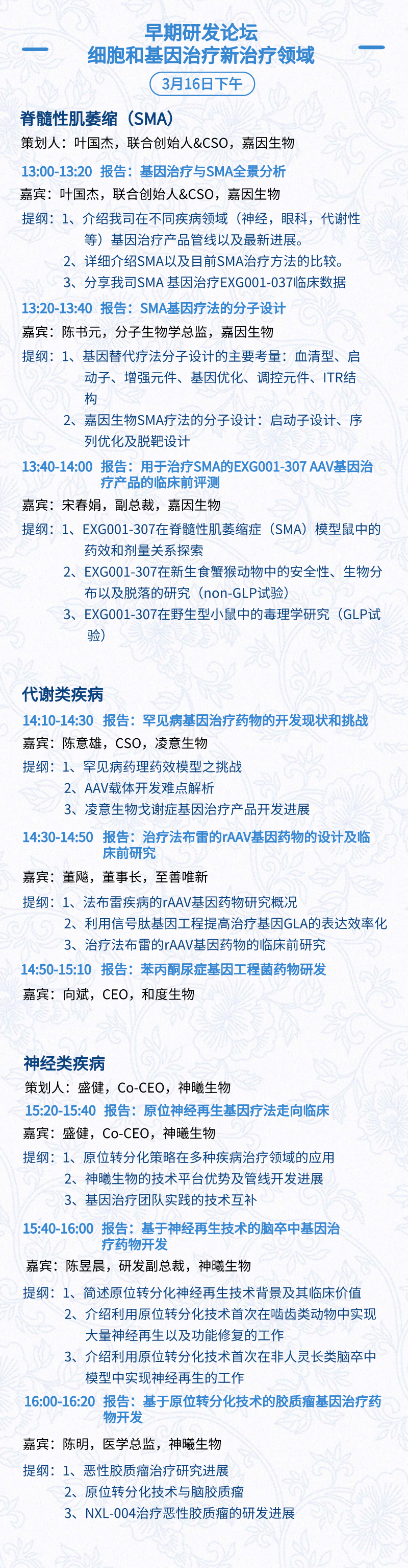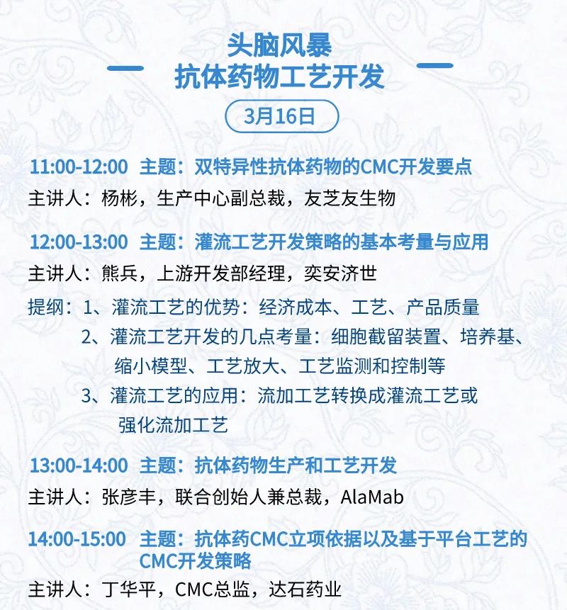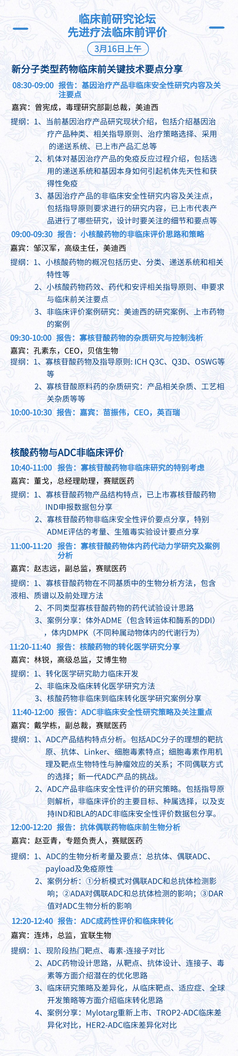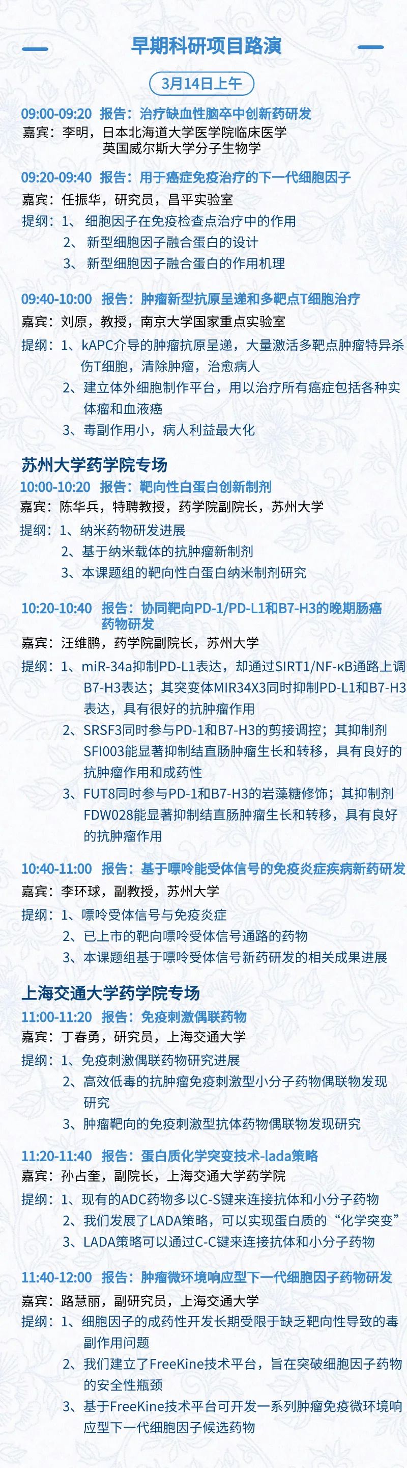 3月15日:开幕式、科学家峰会、细分赛道论坛(抗体、CGT、早研、临床、海外)、投融资&BD 论坛、中心舞台