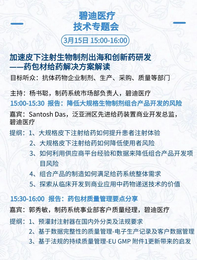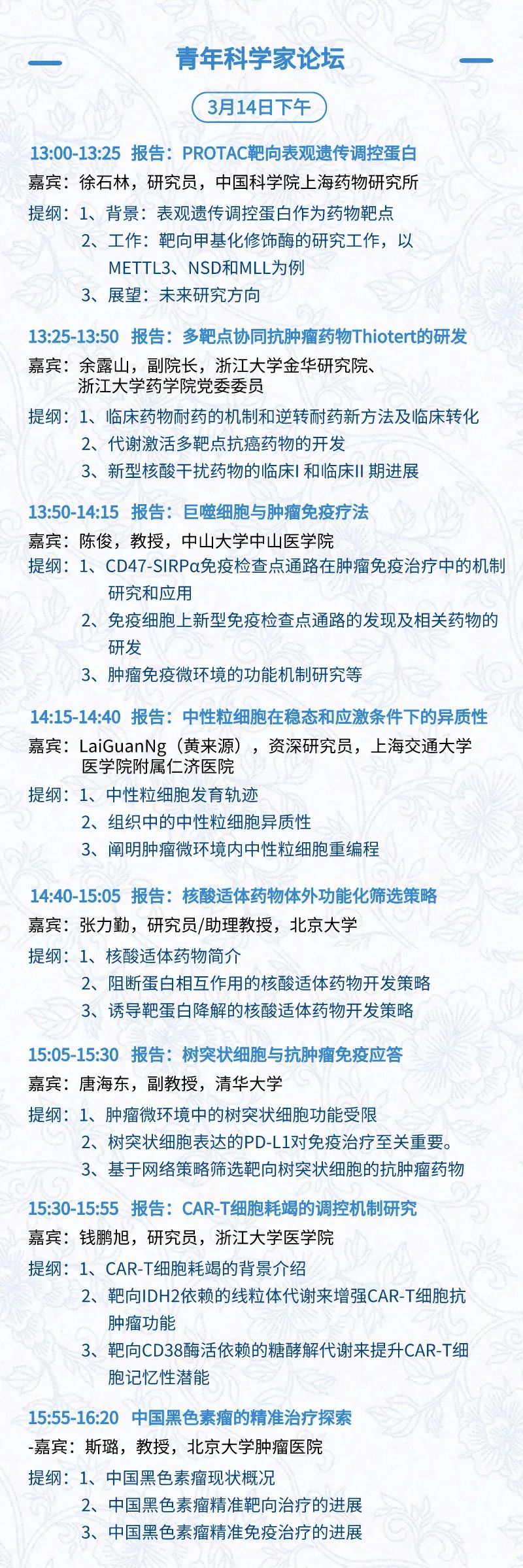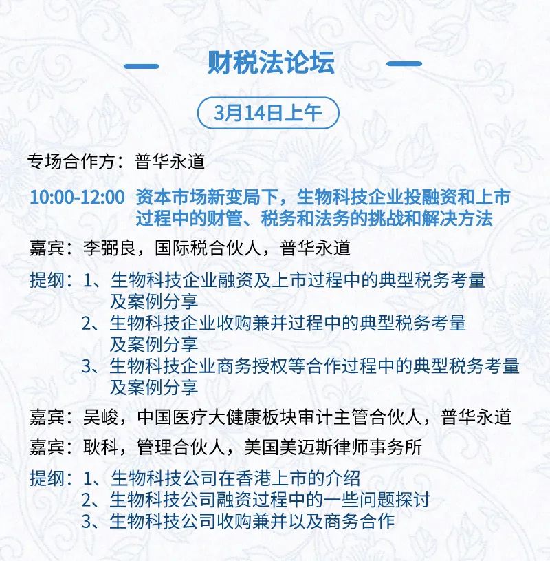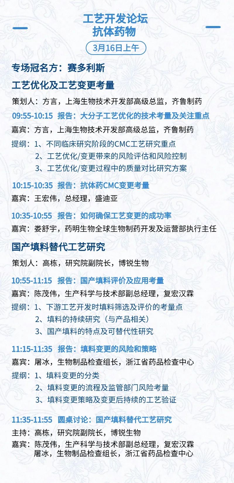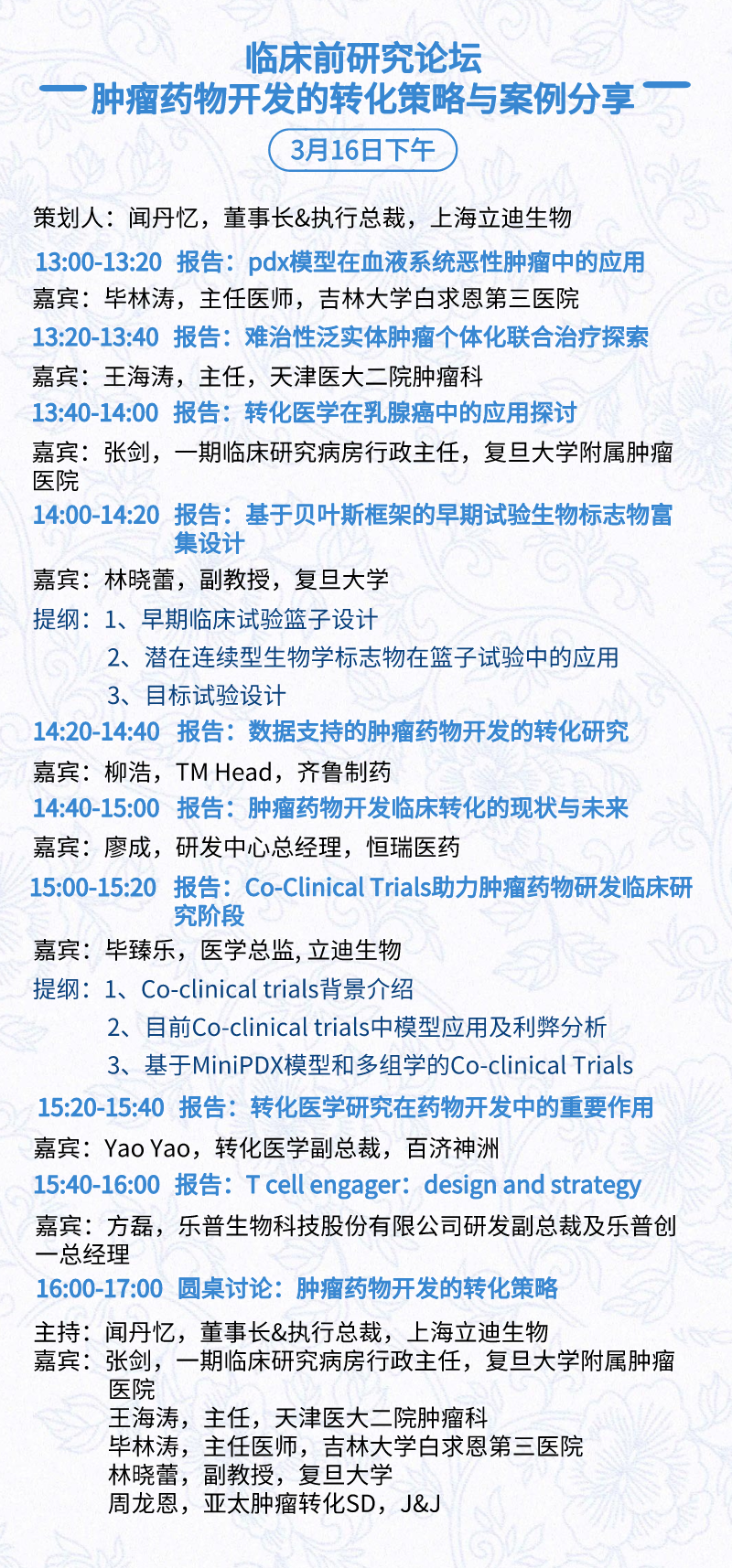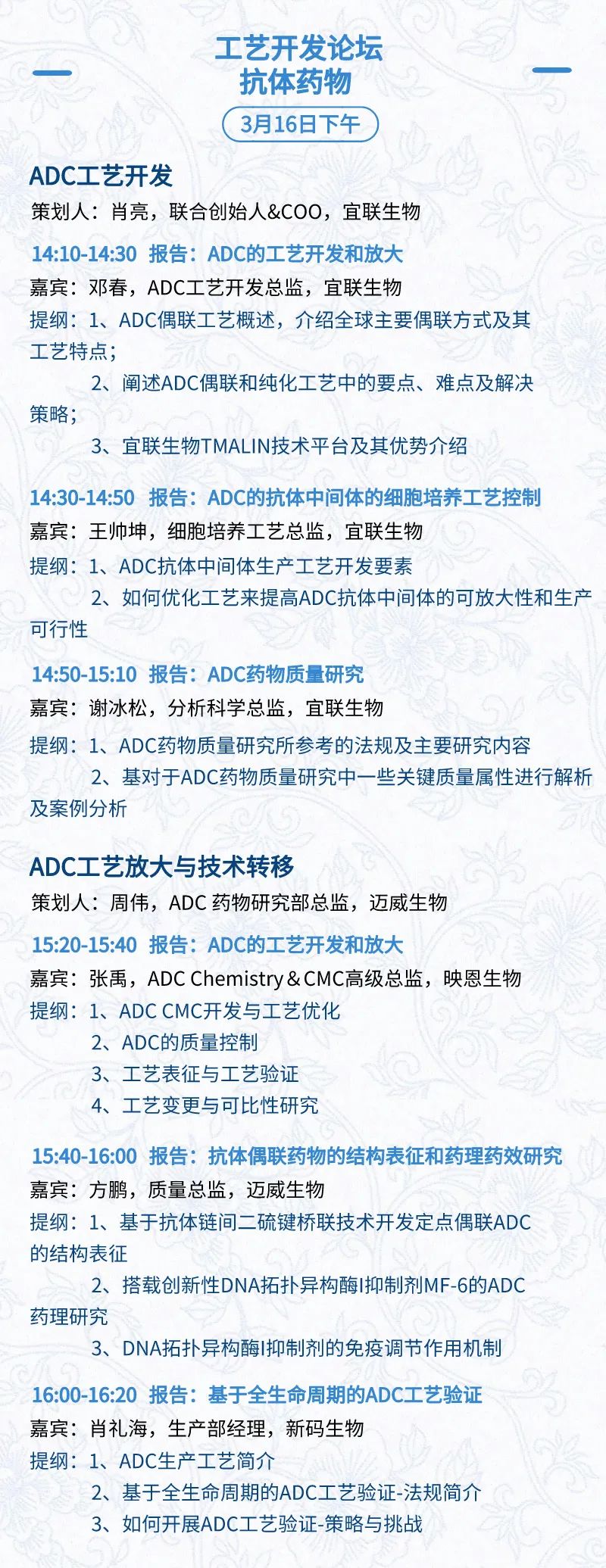 3月15日:开幕式、科学家峰会、细分赛道论坛(抗体、CGT、早研、临床、海外)、投融资&BD 论坛、中心舞台