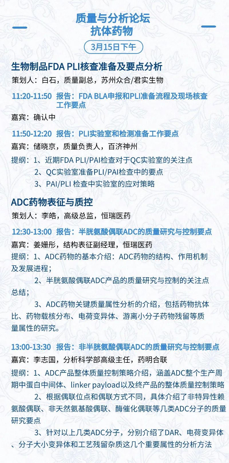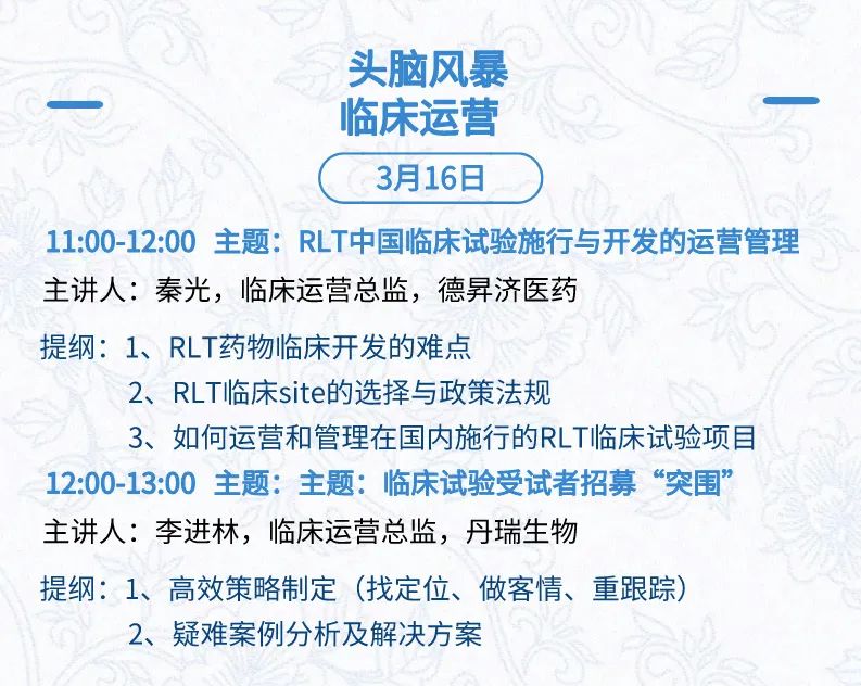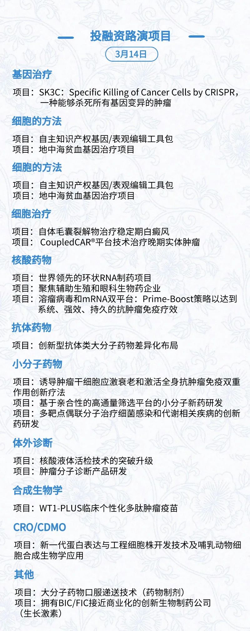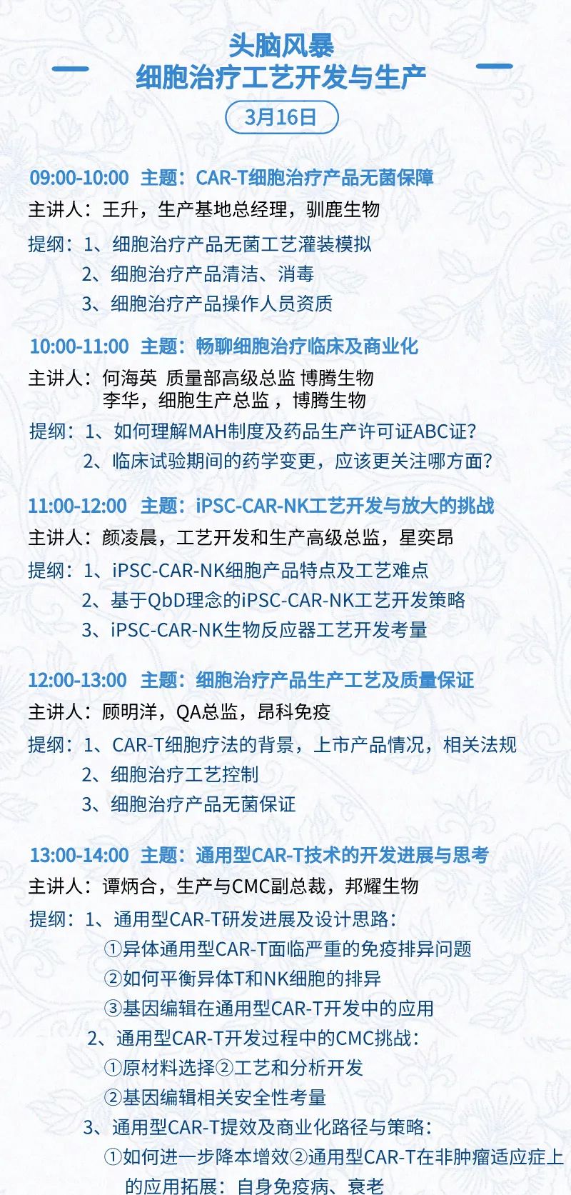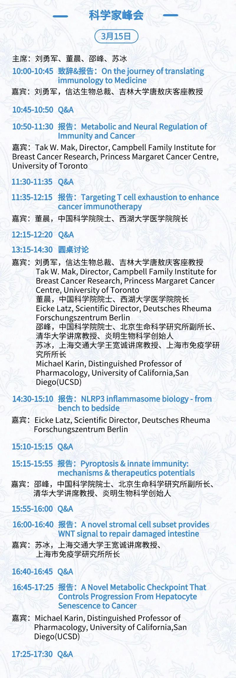 3月15日:开幕式、科学家峰会、细分赛道论坛(抗体、CGT、早研、临床、海外)、投融资&BD 论坛、中心舞台