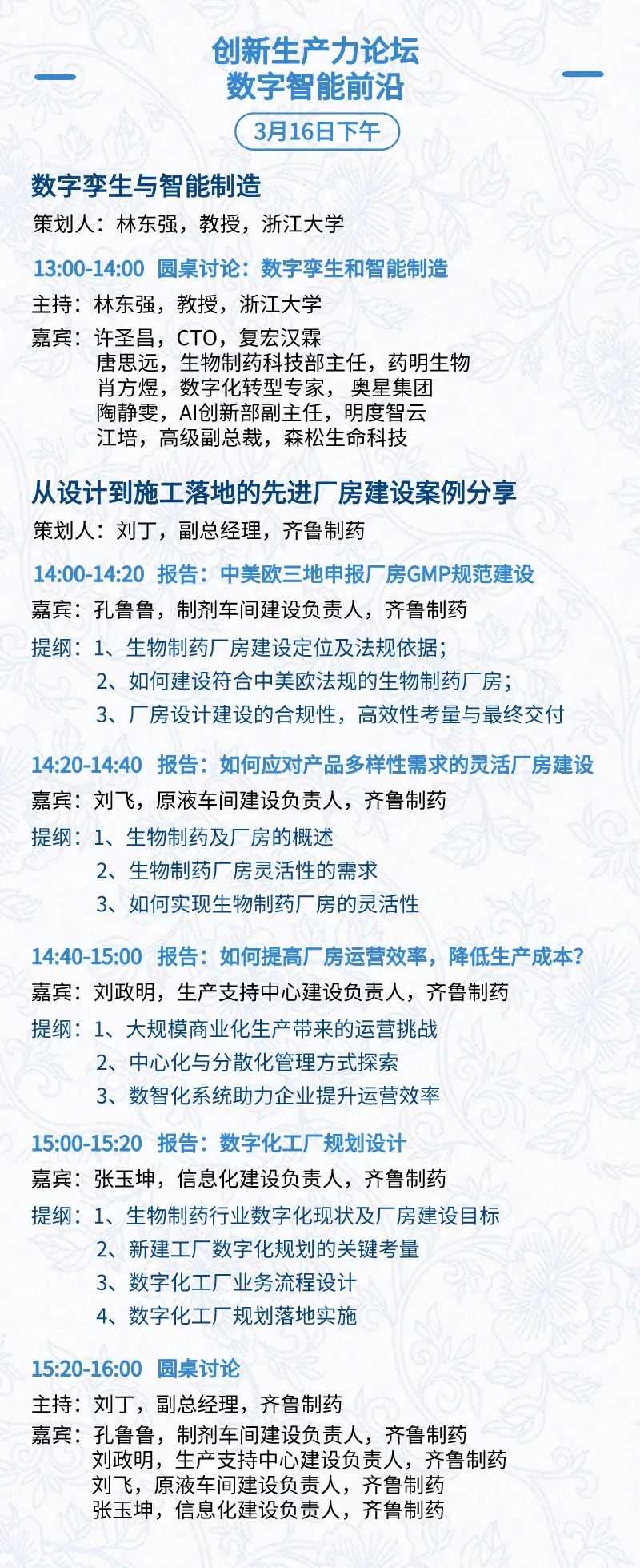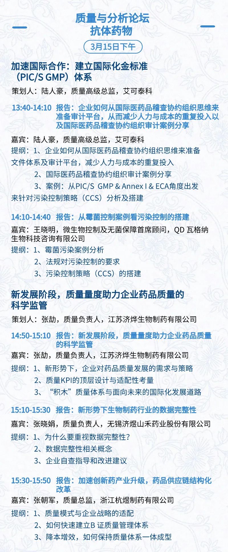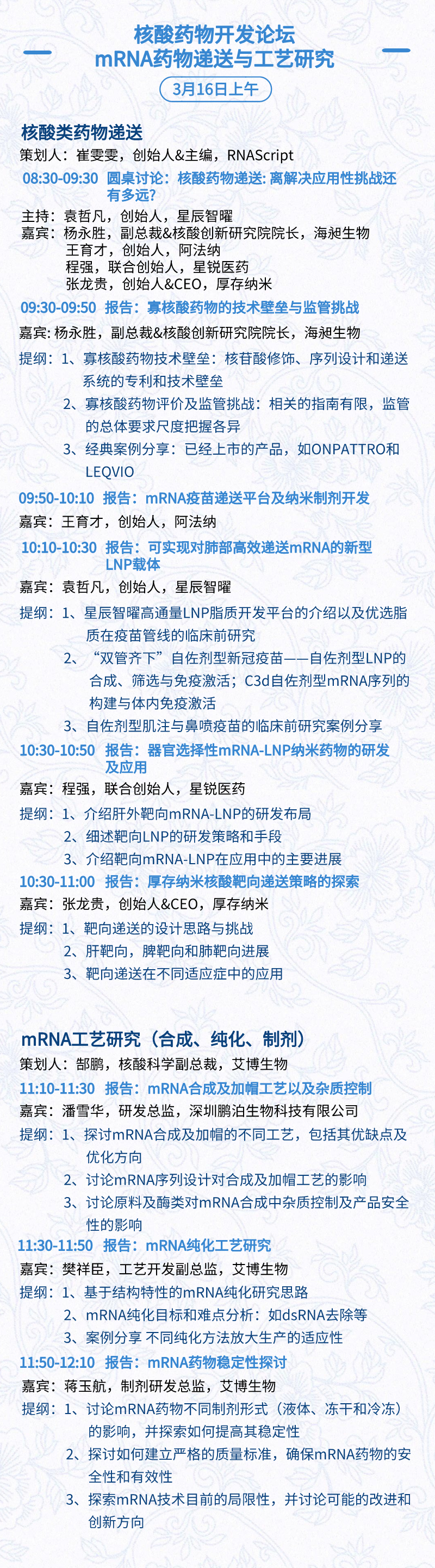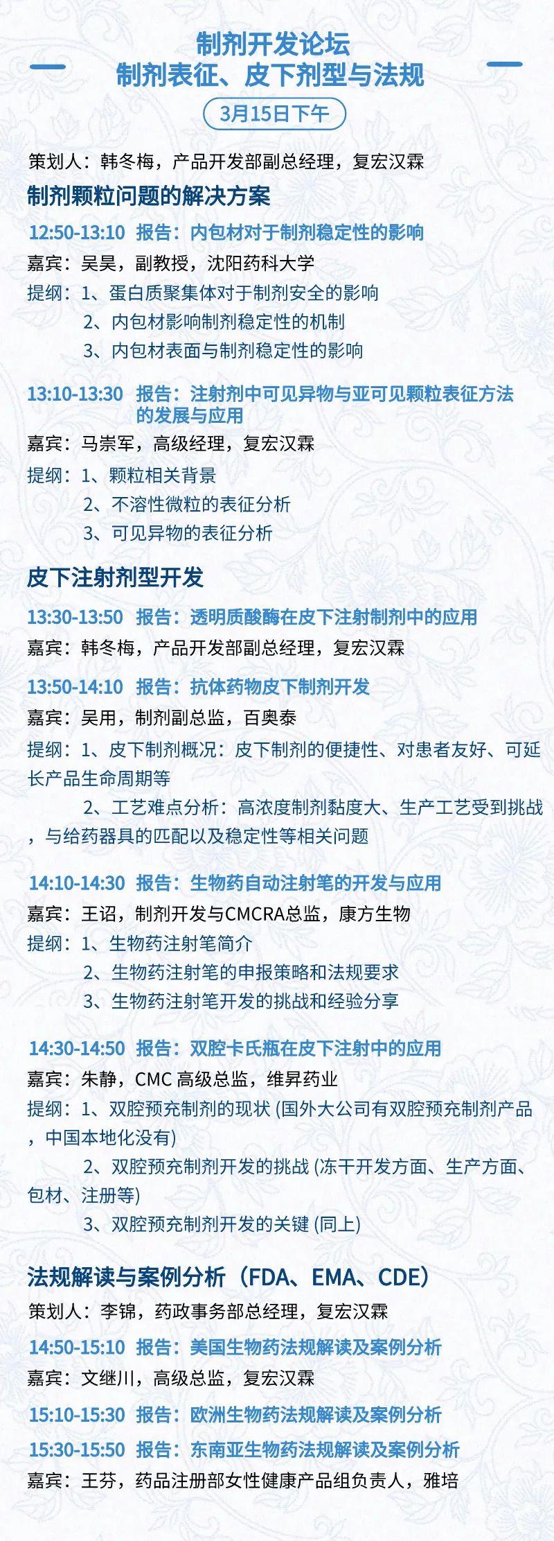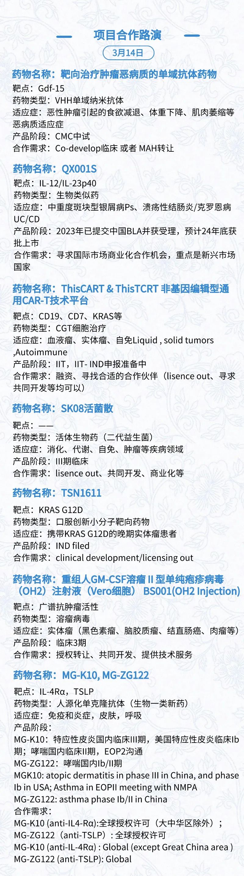 3月15日:开幕式、科学家峰会、细分赛道论坛(抗体、CGT、早研、临床、海外)、投融资&BD 论坛、中心舞台