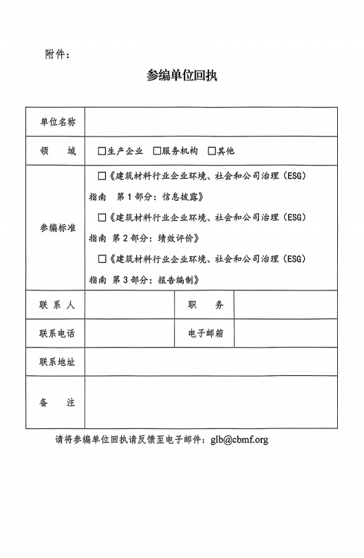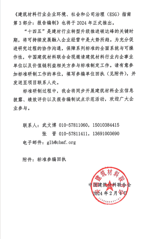 请有意参与标准编制工作的单位,请填写参编单位回执(见附件)并发送至项目联系人。具体事宜将由参编单位与联系人商定,并签订参编协议。在此,我们期待与各单位携手合作,共同推动我国建材行业ESG标准体系的完善与发展。