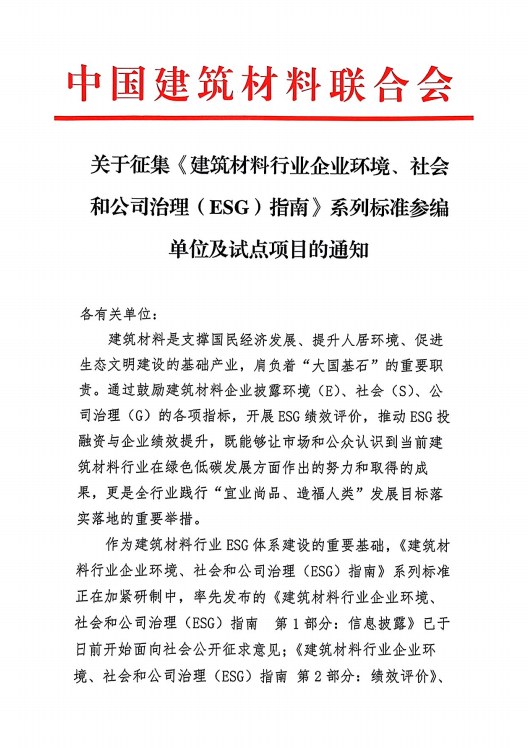 作为建筑材料行业ESG体系建设的重要基础,《建筑材料行业企业环境、社会和公司治理(ESG)指南》系列标准正在加紧研制中,率先发布的《建筑材料行业企业环境、社会和公司治理(ESG)指南 第1部分:信息披露》已于日前开始面向社会公开征求意见;《建筑材料行业企业环境、社会和公司治理(ESG)指南 第2部分:绩效评价》、建筑材料行业企业环境、社会和公司治理(ESG)指南 第3部分:报告编制》也将于2024年正式推出。