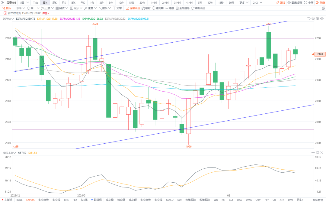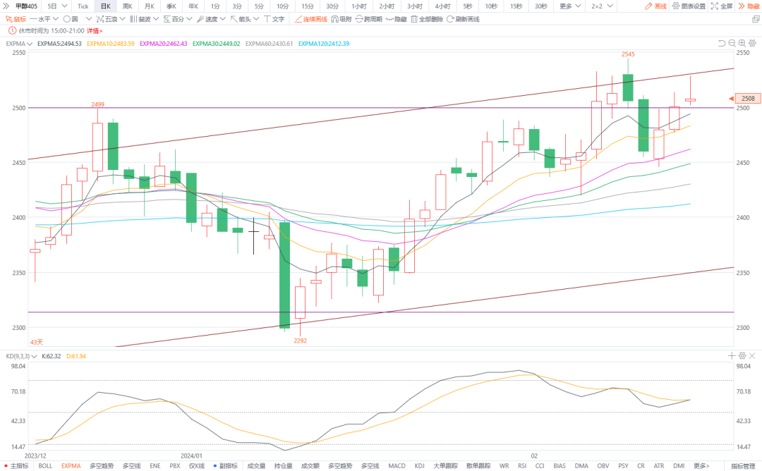 7.甲醇405:预计将偏强震荡。甲醇厂家即将迎来春检,同时伴加进口量有降低预期,供应端或有收紧可能。主流库区汽运提货仍在恢复中,雨雪天气导致运费抬升。节后下游需求缓慢恢复,提货量表现依旧偏弱。图形上,今日价格试探性上涨后小幅回落,在前期通道线之上报收小阳线。下方均线支撑依然有力,KD有交叉向上的倾向。预计短期区间偏强震荡,建议多单可在保证利润的前提下耐心持有。