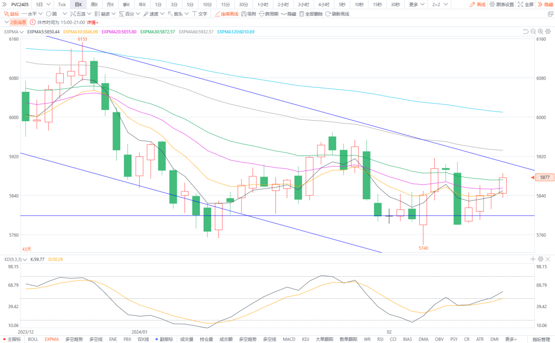 6.PVC2405:预计将震荡整理。节后国内PVC社会仓库库存量预计在58万吨左右。下游终端开机较晚,需求偏弱,预计PVC社会库存维持累库状态。国内出口接单情况较好。供需基本面多空交织。图形上,今日价格低开高走。均线粘合支撑,KD抬头向上。预计期货价格阶段小幅回升,建议短期维持5820-5830逢低做多思路,多单轻仓耐心持有,待价格向上突破5900压力位后可考虑多单加仓。目前暂无做空理由。