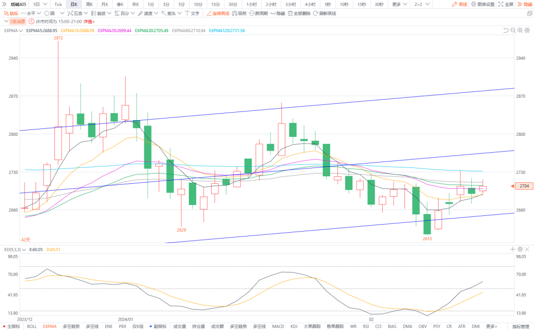3.烧碱405:预计将震荡整理。一方面,氧化铝运行产能有提升预期,纺织印染等下游即将复工。烧碱需求存在补货的增长动机。另一方面,雨雪天气影响物流运输,部分氯碱企业降低生产负荷,库存维持偏高水平。烧碱企业春检可能提前。图形上,今日价格大稳小动。5日10日均线支撑依然有效,预计持续上涨幅度有限。建议短线多单可减仓止盈,中长期价格尚有支撑,压力位暂时看到2720一线。