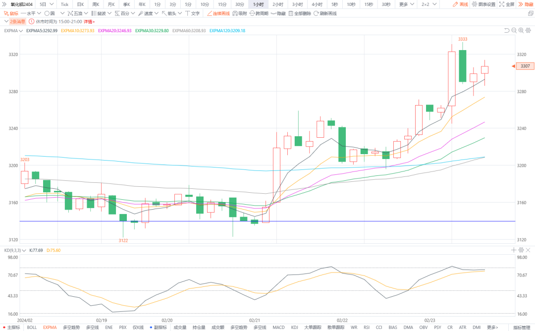 4.氧化铝2404:预计将偏强震荡。今日北方氧化铝现货均价3349元/吨。氧化铝基本面供应偏紧,春节后则有补库需求。国内宏观利好提振,叠加美国计划制裁俄铝消息刺激,基本面整体偏强。图形上,今日价格沿5日均线支撑小幅上涨,均线向上发散。预计短期氧化铝将偏强运行。建议多单耐心持有,止损价格在3260-3270一线。