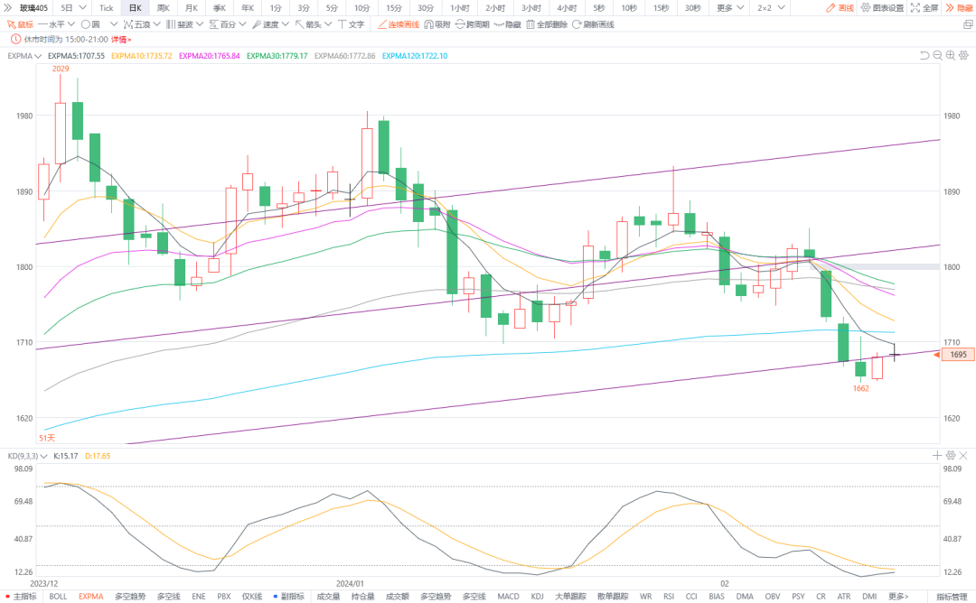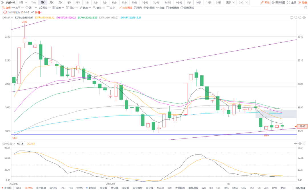 1.纯碱405:预计将震荡整理。纯碱现货价格小幅下调,节后开工率较高,供应维持高位。受降雪天气影响运输受限,厂家库存高企。下游需求偏弱,下周陆续复工,需求有提升预期。目前纯碱供需基本面偏弱。图形上,今日价格弱稳,偶有小幅波动。K线整体还在弱势当中但始终未突破1800支撑。预计将在1900-1800区间震荡游走,不排除1800失守可能性。建议观望。