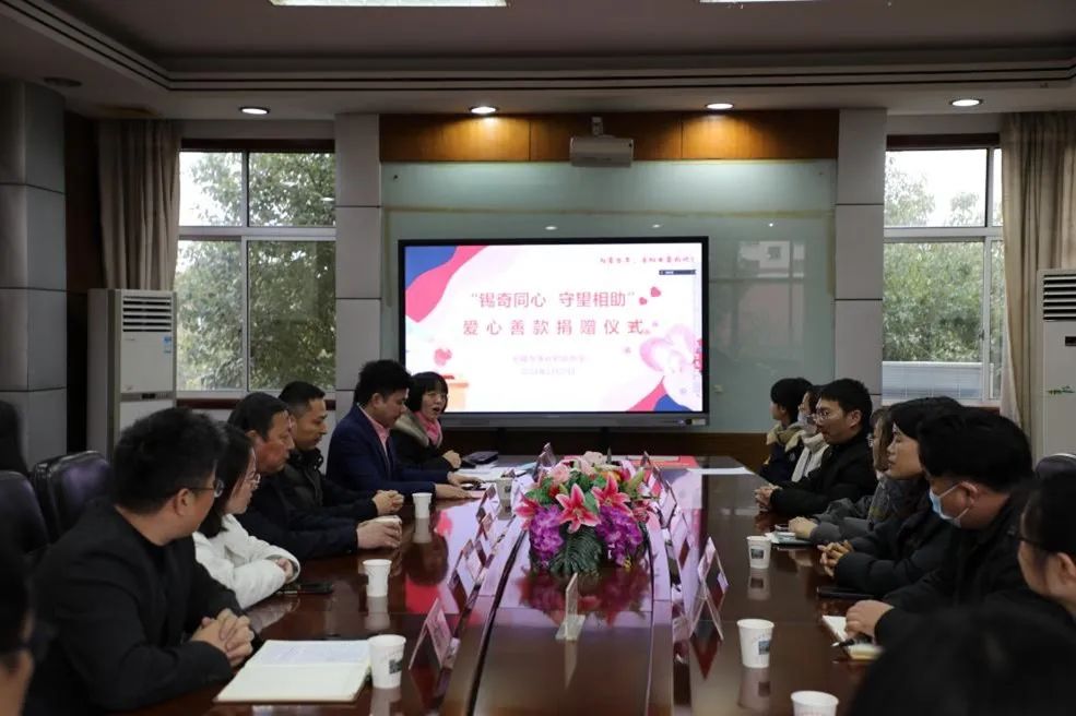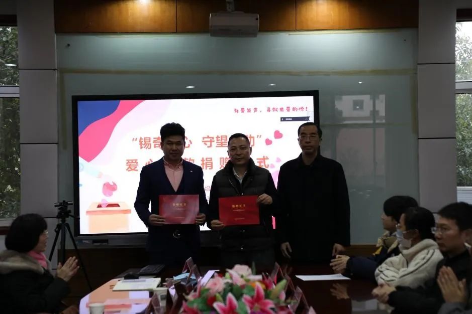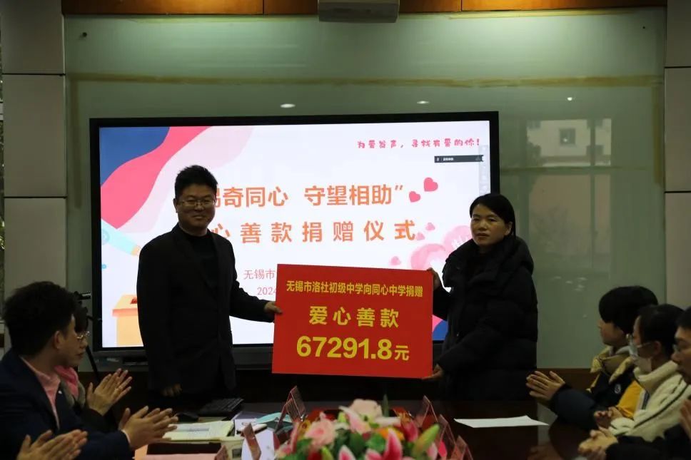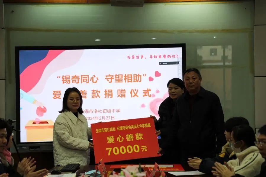 山海不为远,万里心相连。2月22日,“锡奇同心 守望相助”爱心善款捐赠仪式在无锡市洛社初级中学顺利举行。惠山高新区党工委委员姚春晔,石塘湾商会秘书长孙中安,洛社商会和石塘湾商会爱心企业家代表,无锡市洛社初级中学师生代表等17人出席仪式。
