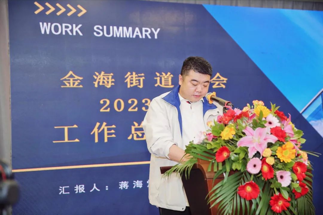 金海街道商会秘书长蒋海堂汇报总结商会过去一年工作和成就,展望未来新机遇、新发展;同时,对各位领导和会员对商会支持与信任表示感谢。