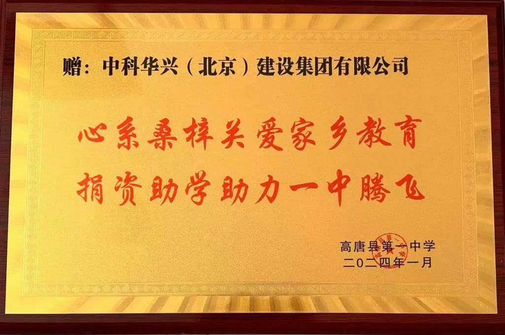 县委常委、副县长刘泰东同志为北京高唐商会会员单位中科华兴建设集团颁授捐赠荣誉牌。