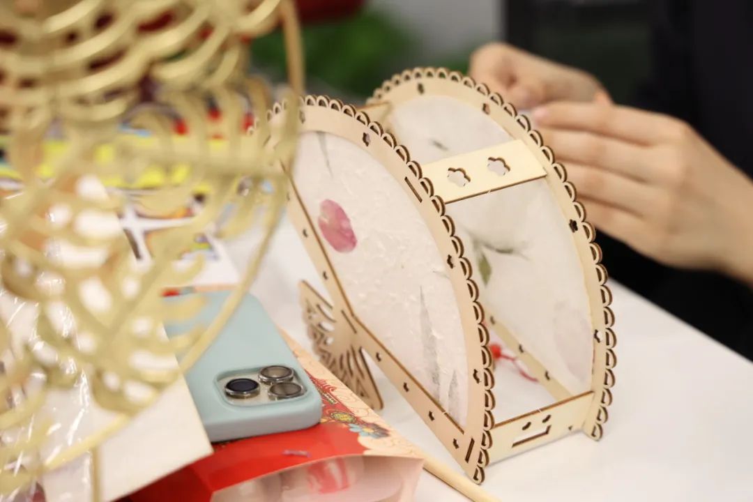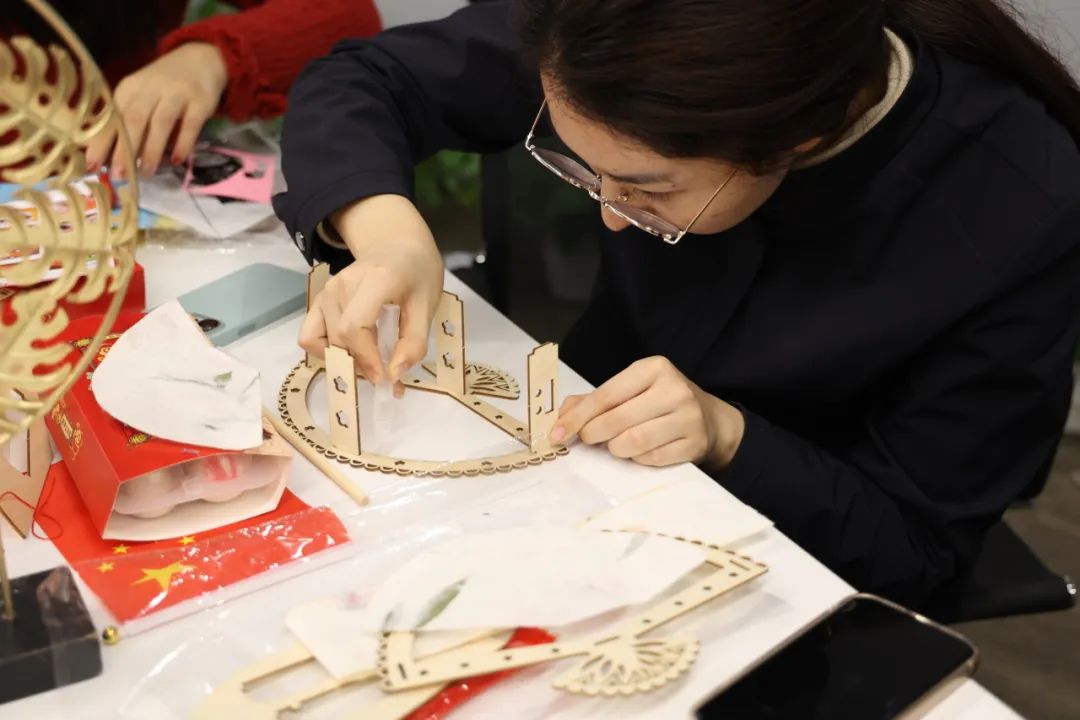 大家一边仔细听着讲解,一边熟悉材料进行制作,通过搭建、固定、组装等步骤,绑挂坠、穿红绳、安装串灯,一个个栩栩如生的龙形花灯、造型别致的花草灯制作完成了。大家互相展示刚制做好的花灯,现场一派热闹景象。