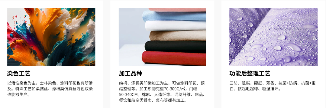 精通各种纺织加工品种,主要专注于纯棉、涤棉类印染加工。然而,这只是众多服务之一!另外还可进行涂料印花、预缩整理等处理。处理的织物克重范围在70-300g/㎡之间,加工门幅范围为50-340cm。此外,还可以处理棉麻、人造纤维(如天丝、莫代尔、竹纤维和粘胶)、混纺纤维(如人棉和天丝棉)等材质。而加工服务不仅局限于面料,还可以为床品、餐饮用品以及航空类餐巾、桌布等提供印染和加工服务。