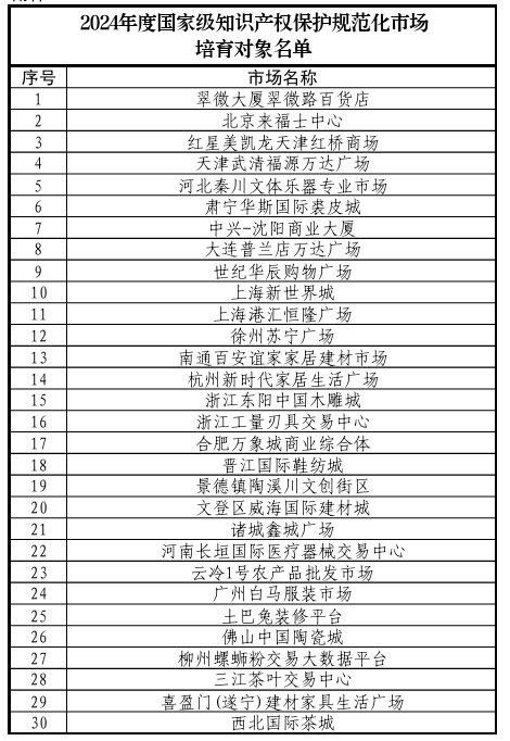日前,国家知识产权局对2024年度国家级知识产权保护规范化市场培育对象名单进行公示,公示期为2024年2月18日至2024年3月1日。全国共有30家市场上榜,其中包括肃宁华斯国际裘皮城、晋江国际鞋纺城、广州白马服装市场等多家纺织服装专业市场。