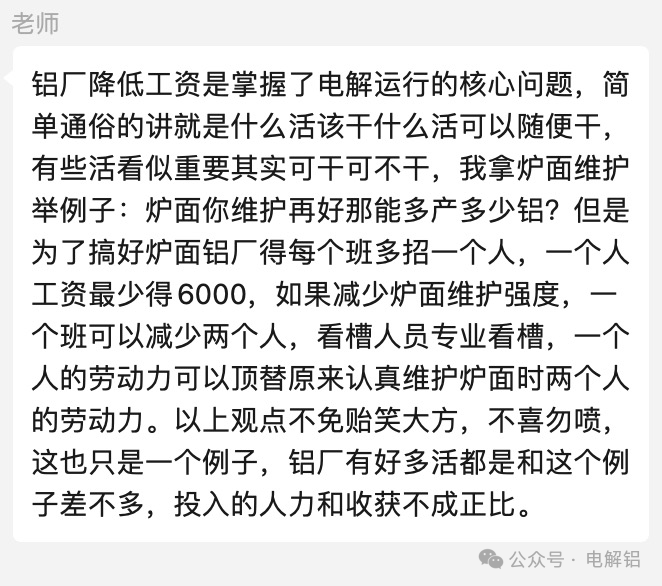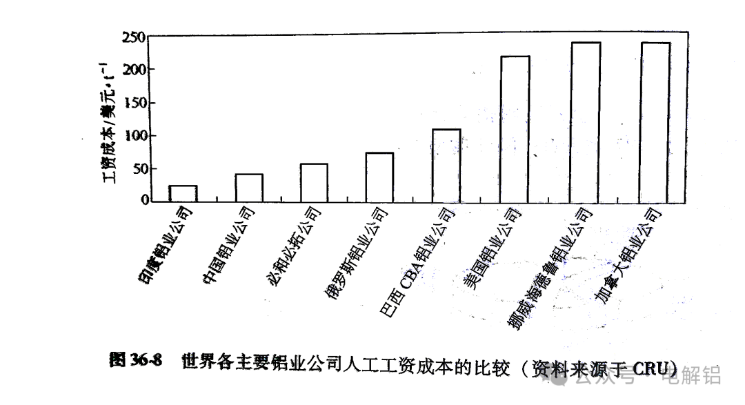 中国的电解铝厂劳动定员多,但是工资水平相对较低,近20多年来人员大幅缩减,但人工成本比例就没变过,目前国内部分企业人工成本也就200元人民币/吨铝左右。主要靠压减人员数量来获得这么低的人工成本的。尤其是推行计件制度后,电解工人员流动及人员紧缺状态就更严重了。