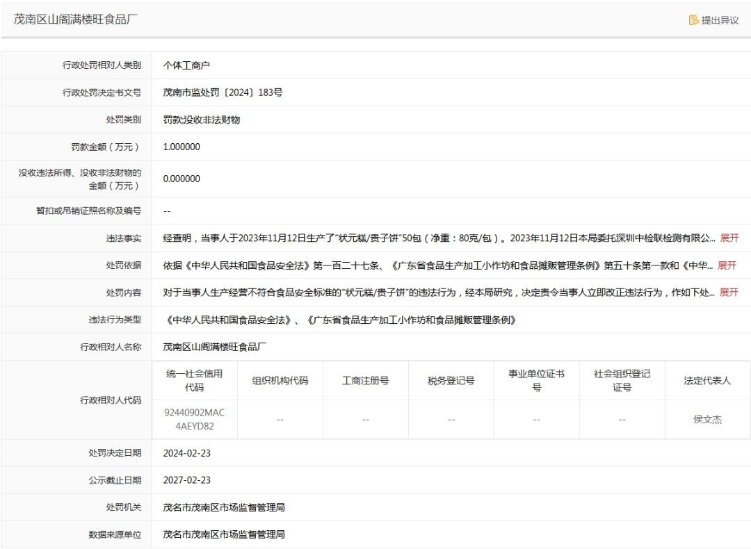 经查明,当事人于2023年11月12日生产了“状元糕/贵子饼”50包(净重:80克/包)。2023年11月12日本局委托深圳中检联检测有限公司对上述批次“状元糕/贵子饼”进行抽样检验,检验结论为:经抽样检验,霉菌项目不符合GB7099-2015《食品安全国家标准糕点、面包》要求,检验结论为不合格。本局于2023年12月11日将上述检验报告送达当事人,当事人在法定期限内对检验结果没有提出异议。至案发时止,该批次“状元糕/贵子饼”于2023年11月12日销售25包给抽样单位用于检验,销售价格为2元/包,剩余25包于2023年12月11日被本局依法扣押。当事人生产的上述不符合食品安全标准的食品货值金额为100元。又查明,当事人在生产经营过程当中,没有建立进货(原辅材料)及销售台账。